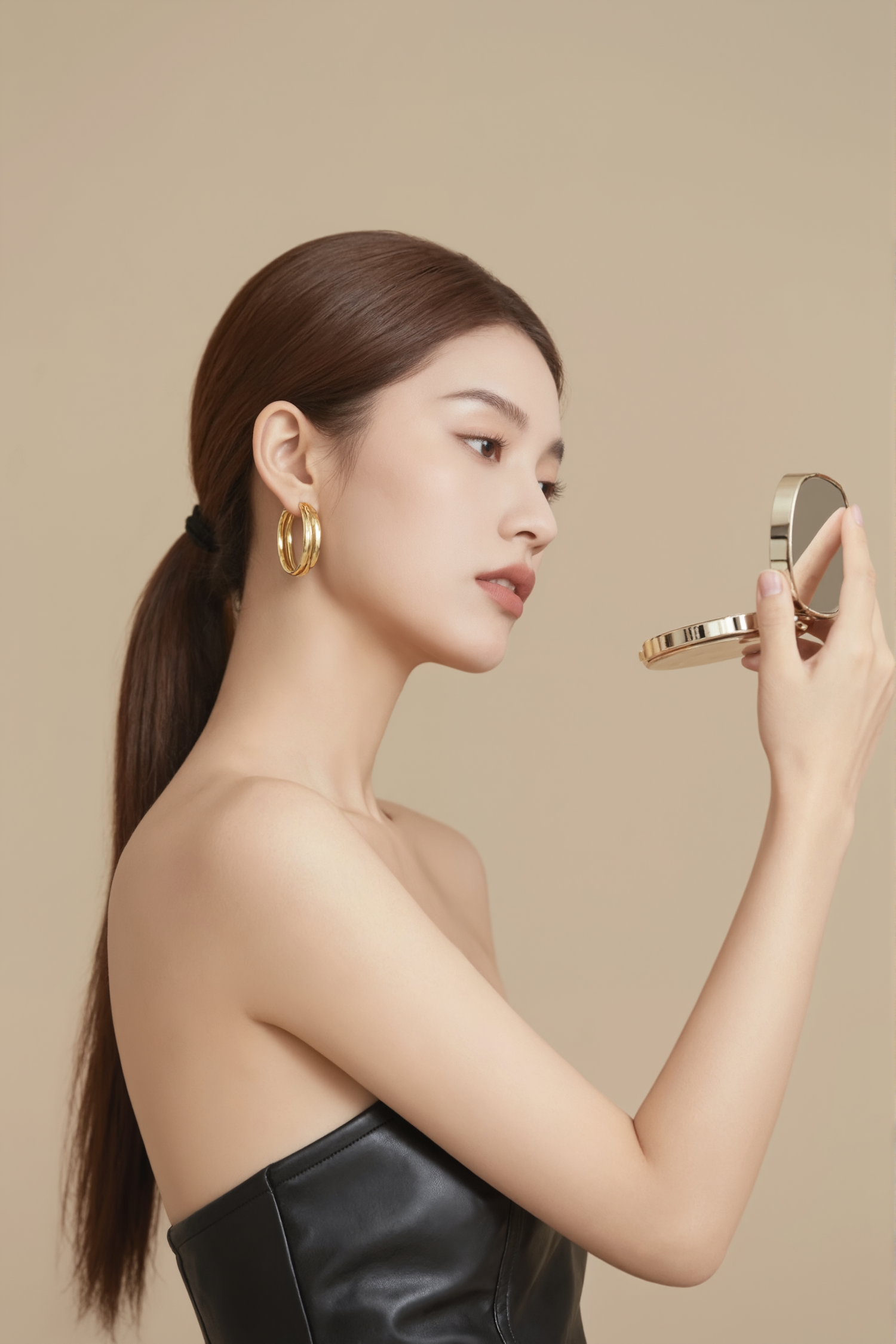 Elegant woman in a black leather top holding a gold compact mirror, with gold hoop earrings and a minimalist beige background.