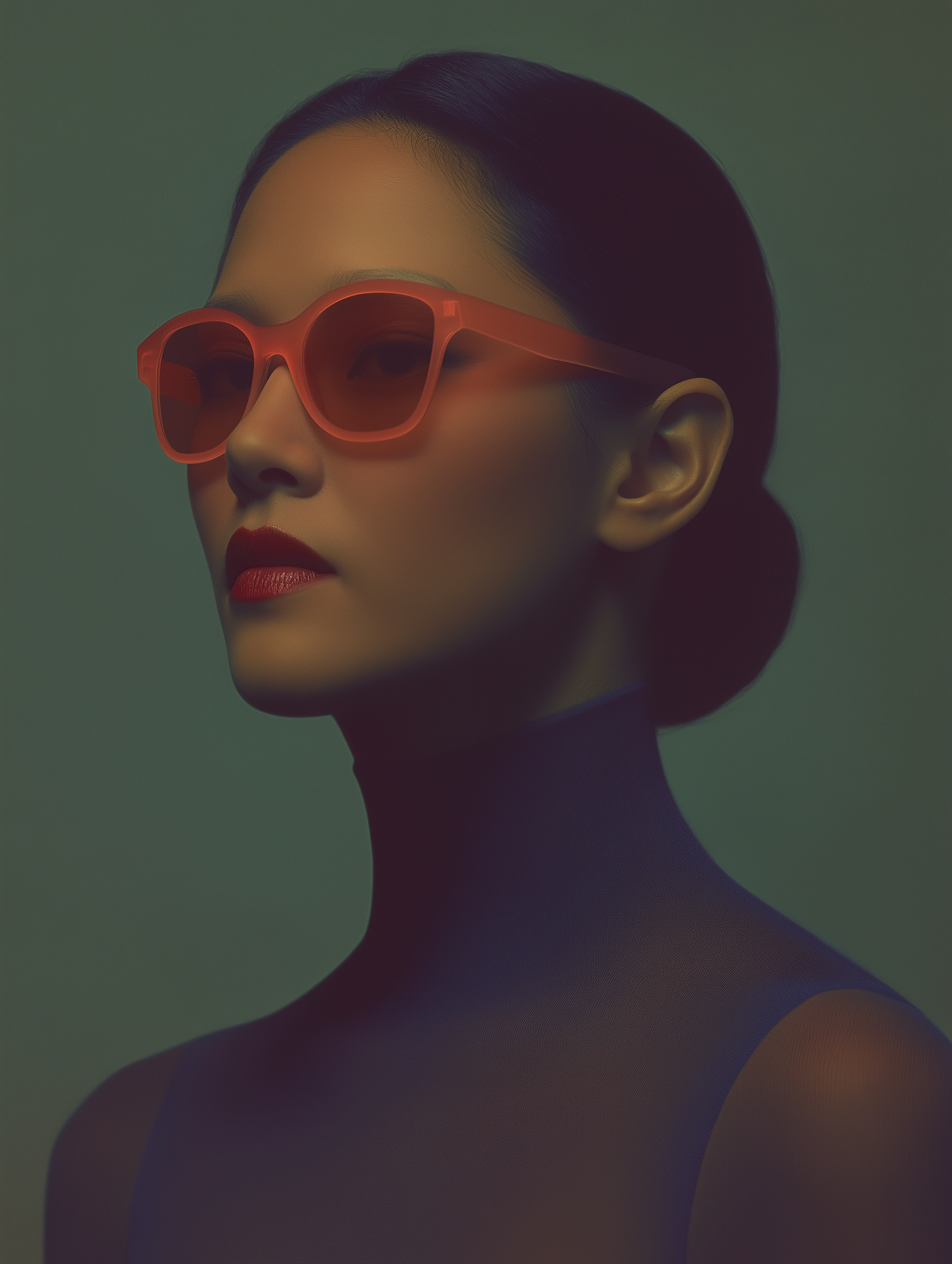 Stylish portrait of an Asian woman in red sunglasses and a dark outfit against a muted green background.