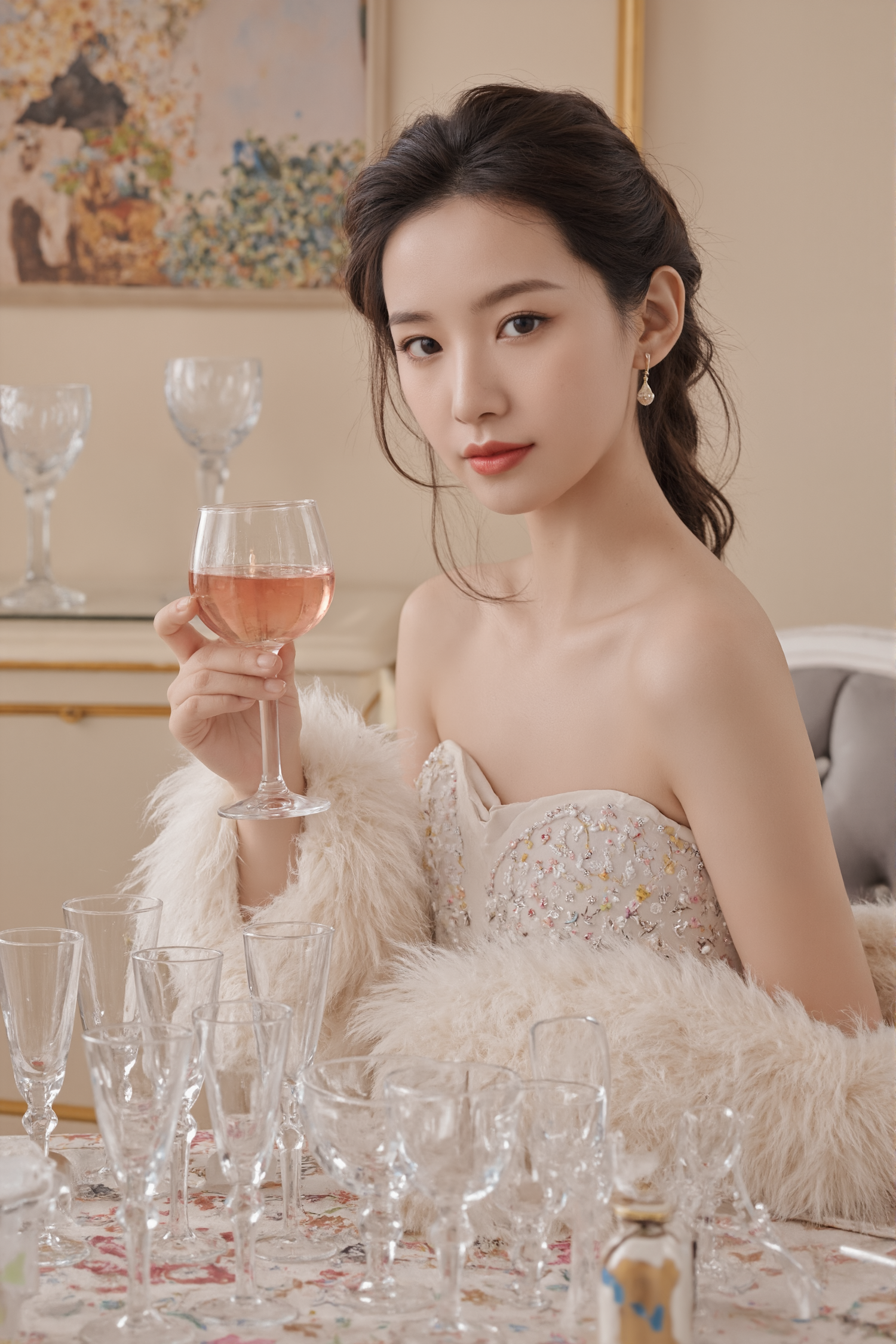 Elegant woman in a strapless dress holding a glass of rosé wine, surrounded by crystal glasses in a sophisticated setting.