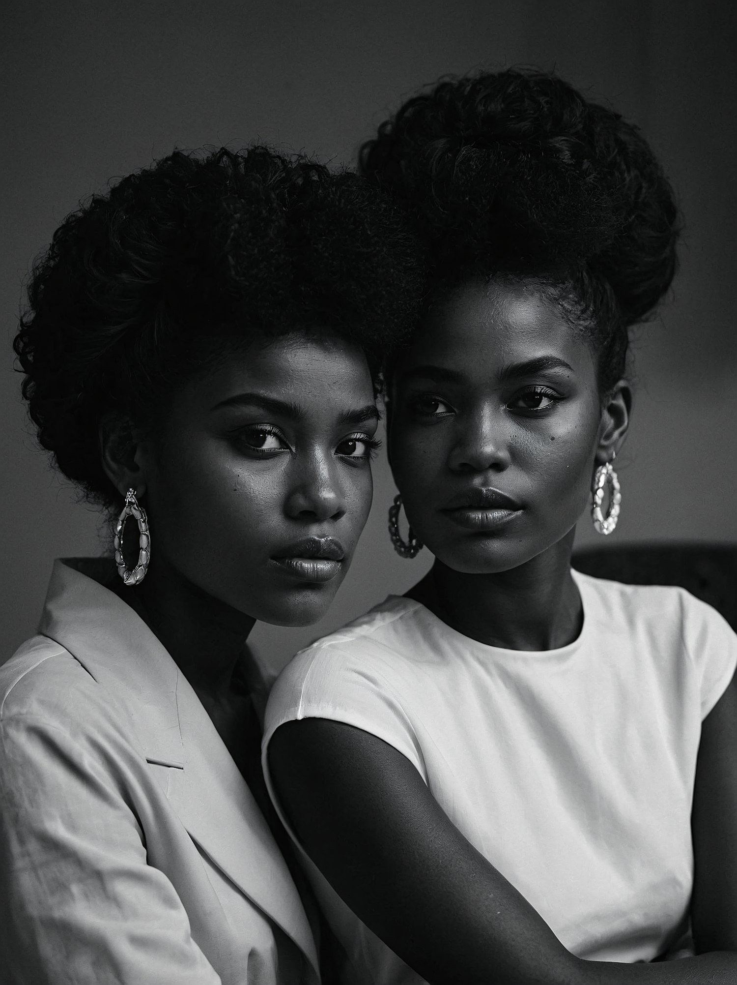Monochrome portrait of two Black women with elegant updos and hoop earrings, exuding unity and sophistication.