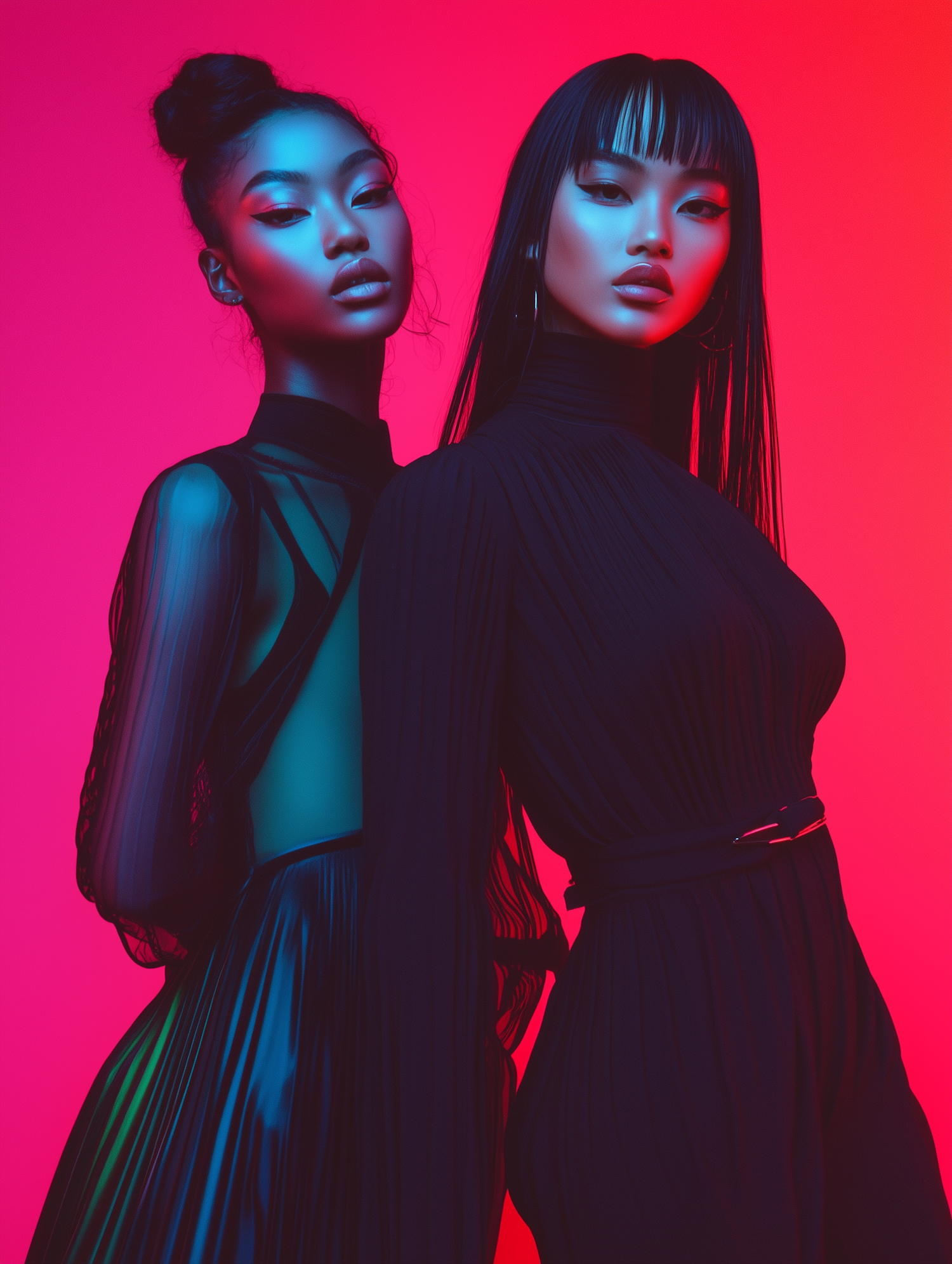 Two stylish women in black dresses pose against a bold red-pink gradient background, showcasing striking makeup and elegant fashion.