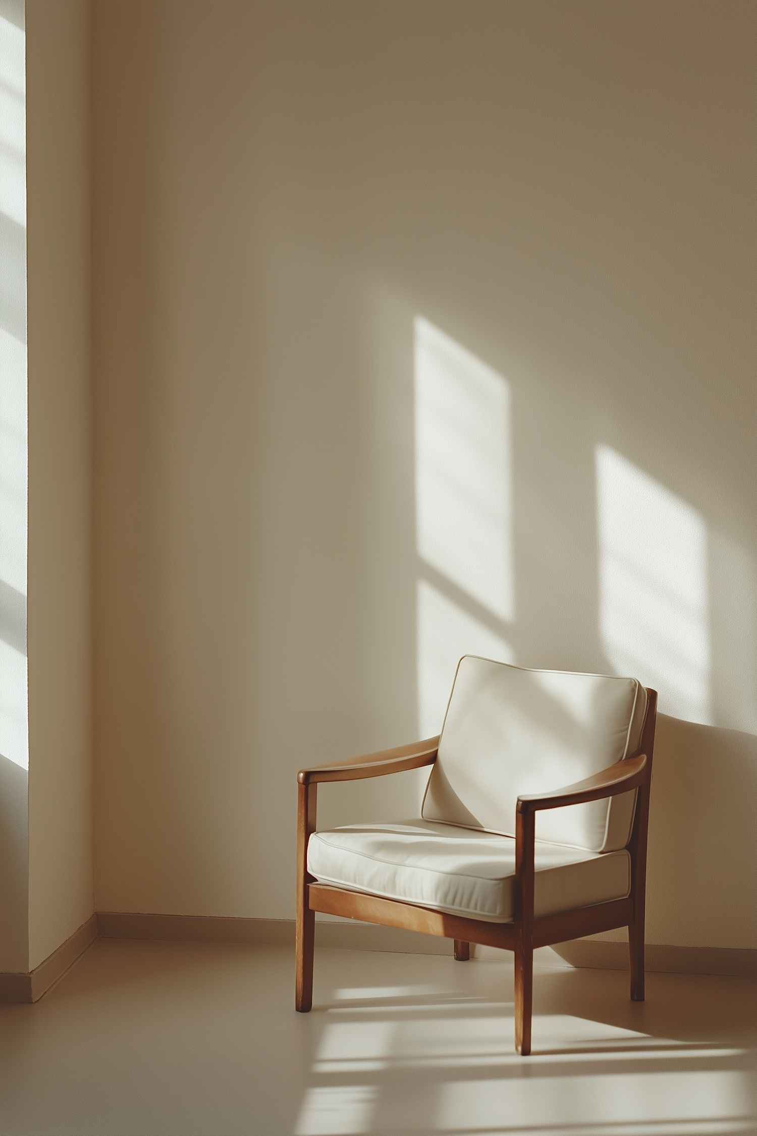 Minimalist wooden armchair with cream cushions in sunlit room, casting geometric shadows on a beige wall.