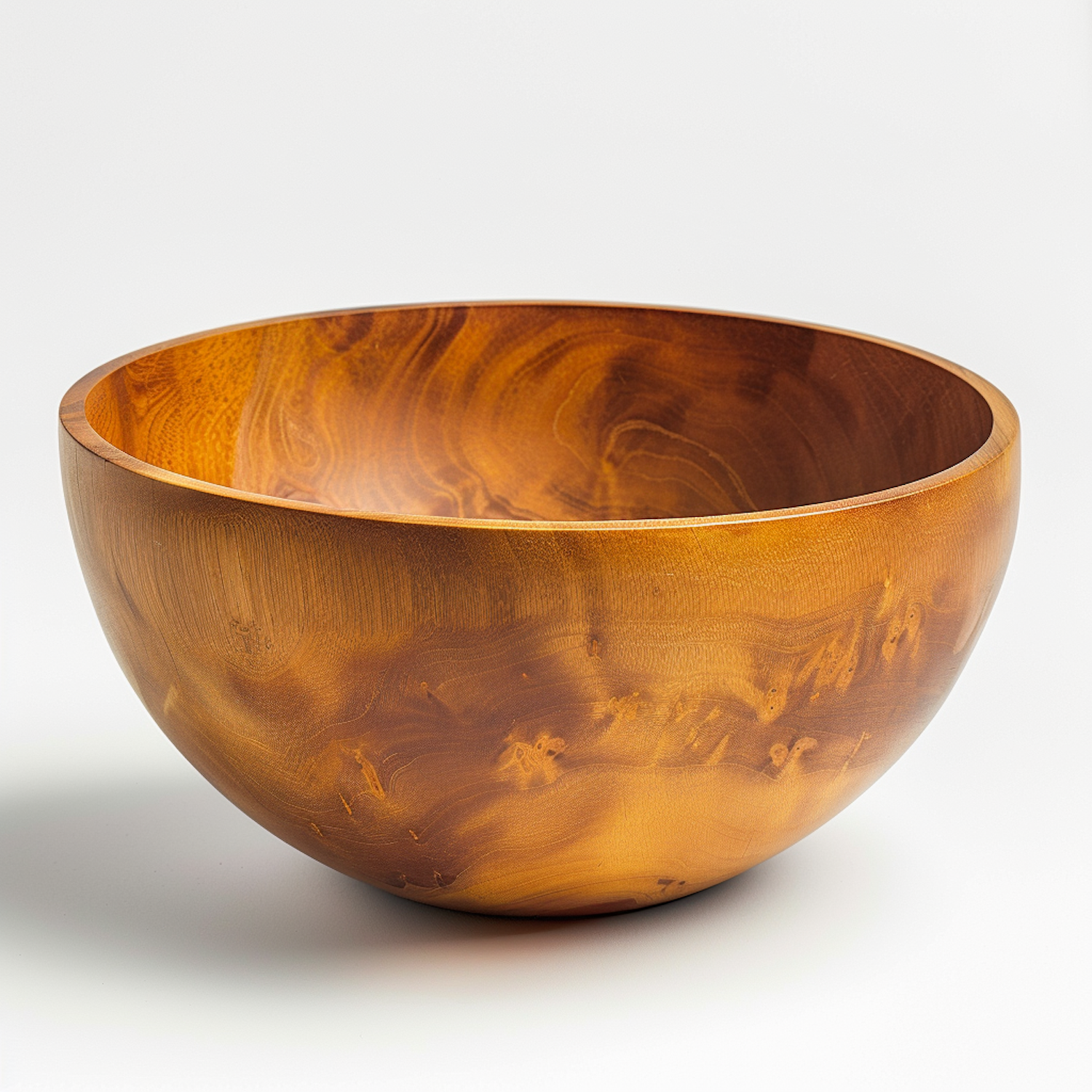 Elegant wooden bowl with rich grain patterns and a polished finish, perfect for decor or serving. Minimalist design on a white background.