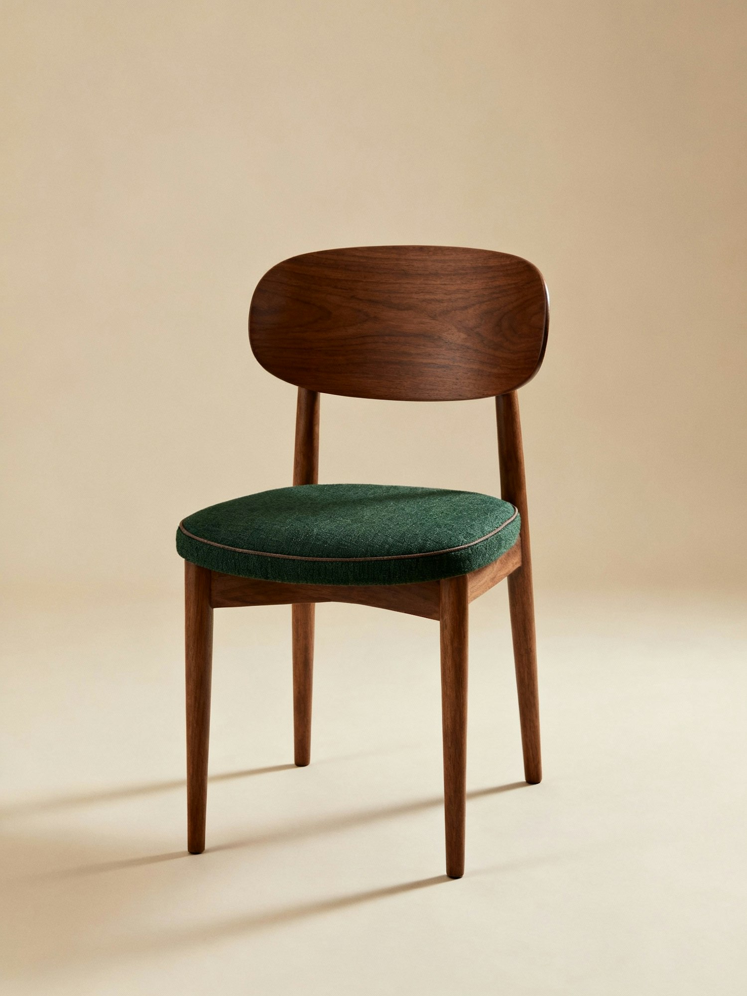Professional studio photography, neutral beige background, soft diffused lighting, sharp focus. A mid-century modern dining chair with a solid walnut wooden frame, slightly tapered legs, and a gently curved backrest. The seat is upholstered in deep green textured fabric, with clean stitched edges. The proportions are slim and elegant, with a timeless retro-modern silhouette. Photographed straight from the front, centered composition, showing the seat and backrest symmetrically.