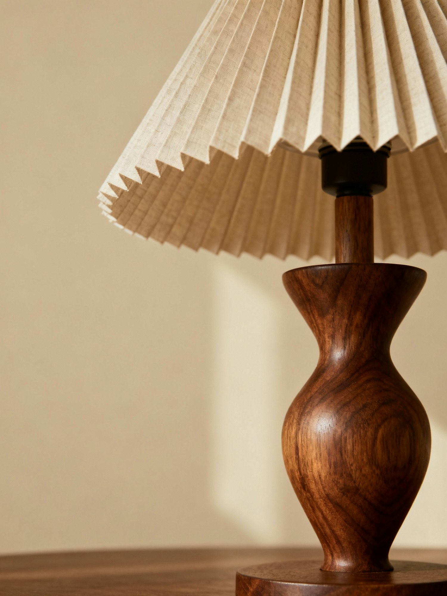 Professional interior design photography, warm and textured atmosphere, soft natural lighting, retro-modern aesthetic, mid-century inspired furniture, crafted wooden details, neutral tones with accents of earthy colors, editorial style, timeless and sophisticated mood. A mid-century inspired lamp with a sculptural wooden base and a pleated lampshade, photographed against a neutral beige backdrop. Professional studio photo with soft natural lighting and subtle shadows, focusing on the crafted details and elegant silhouette.