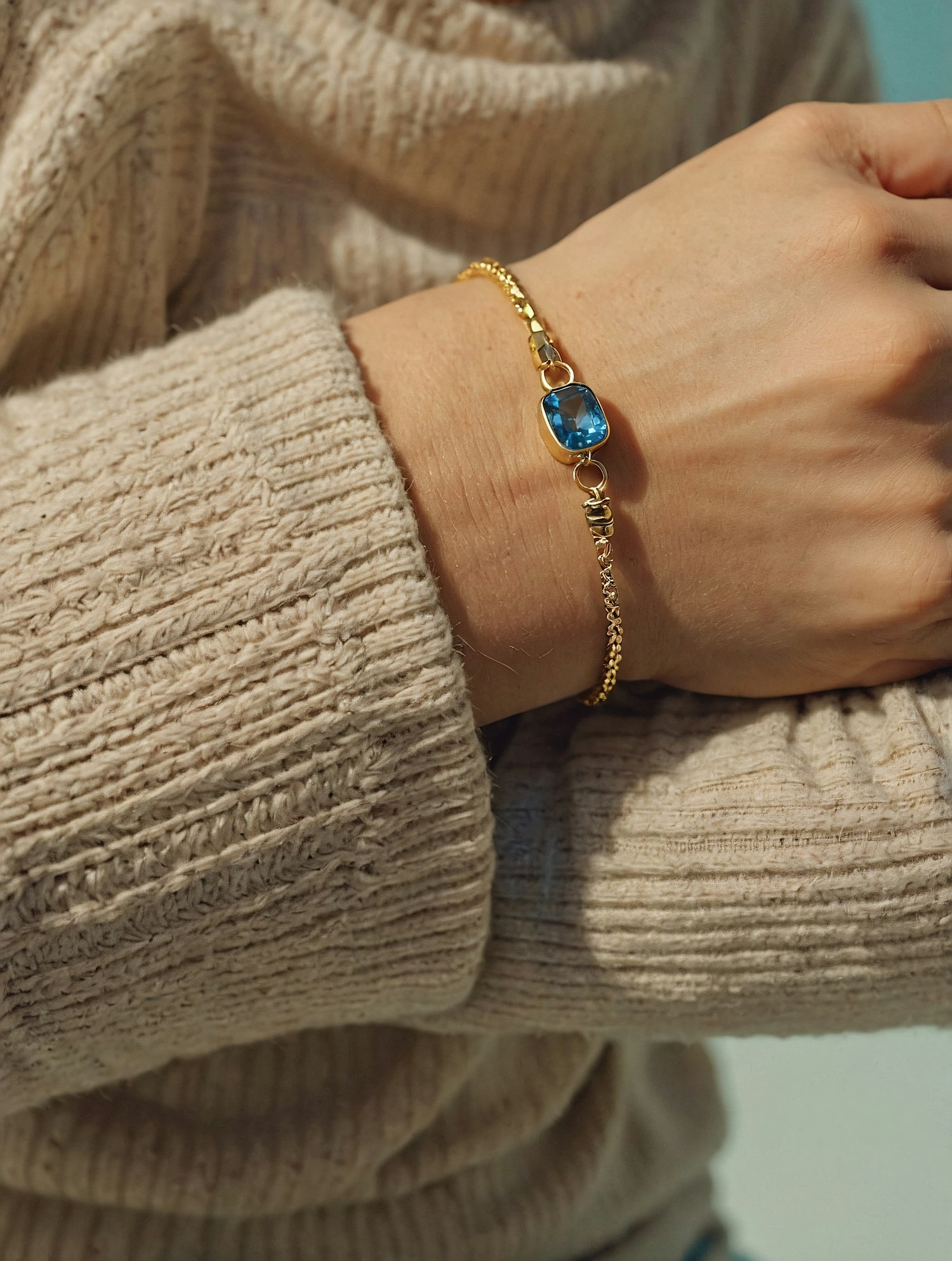 Close-up of a gold bracelet with a blue gemstone on a wrist, paired with a beige knit sweater for a cozy and stylish look.