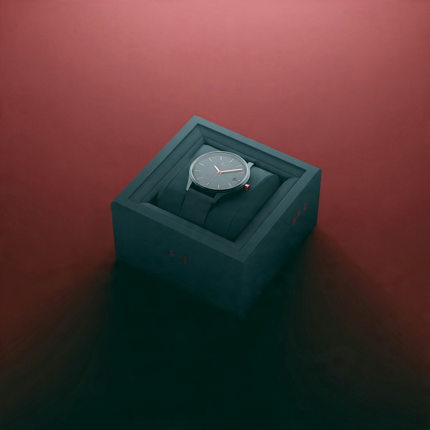 Minimalist wristwatch in a dark cushioned box, set against a gradient red-to-black background, showcasing modern elegance.