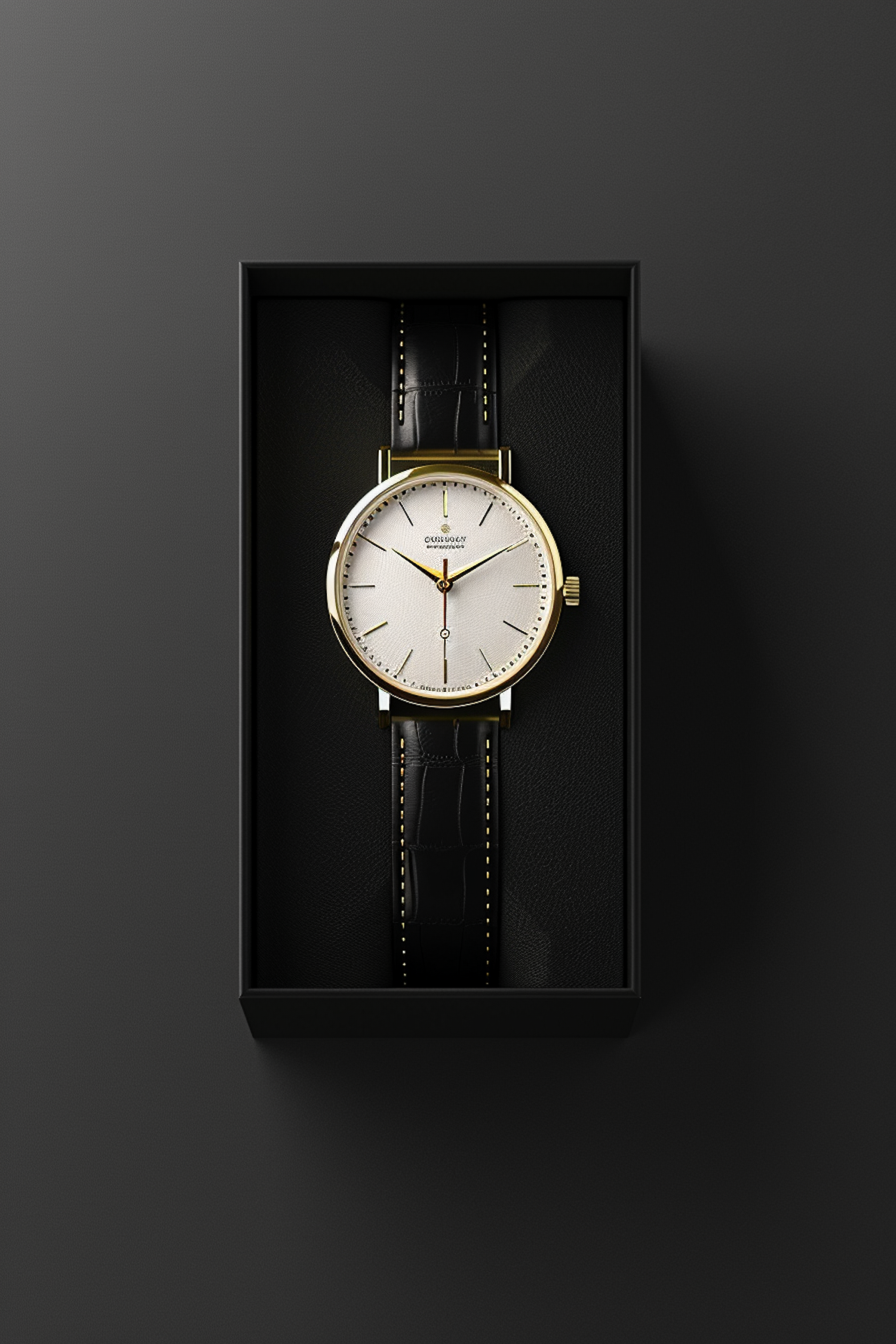 Elegant gold and black wristwatch with a minimalist white dial in a sleek black box, featuring a leather strap and refined design.
