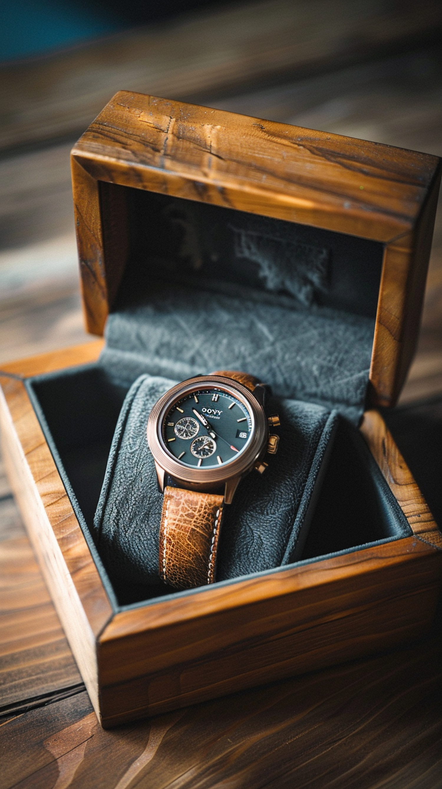 Elegant wristwatch with brown leather strap in a polished wooden box, showcasing luxury and sophistication.