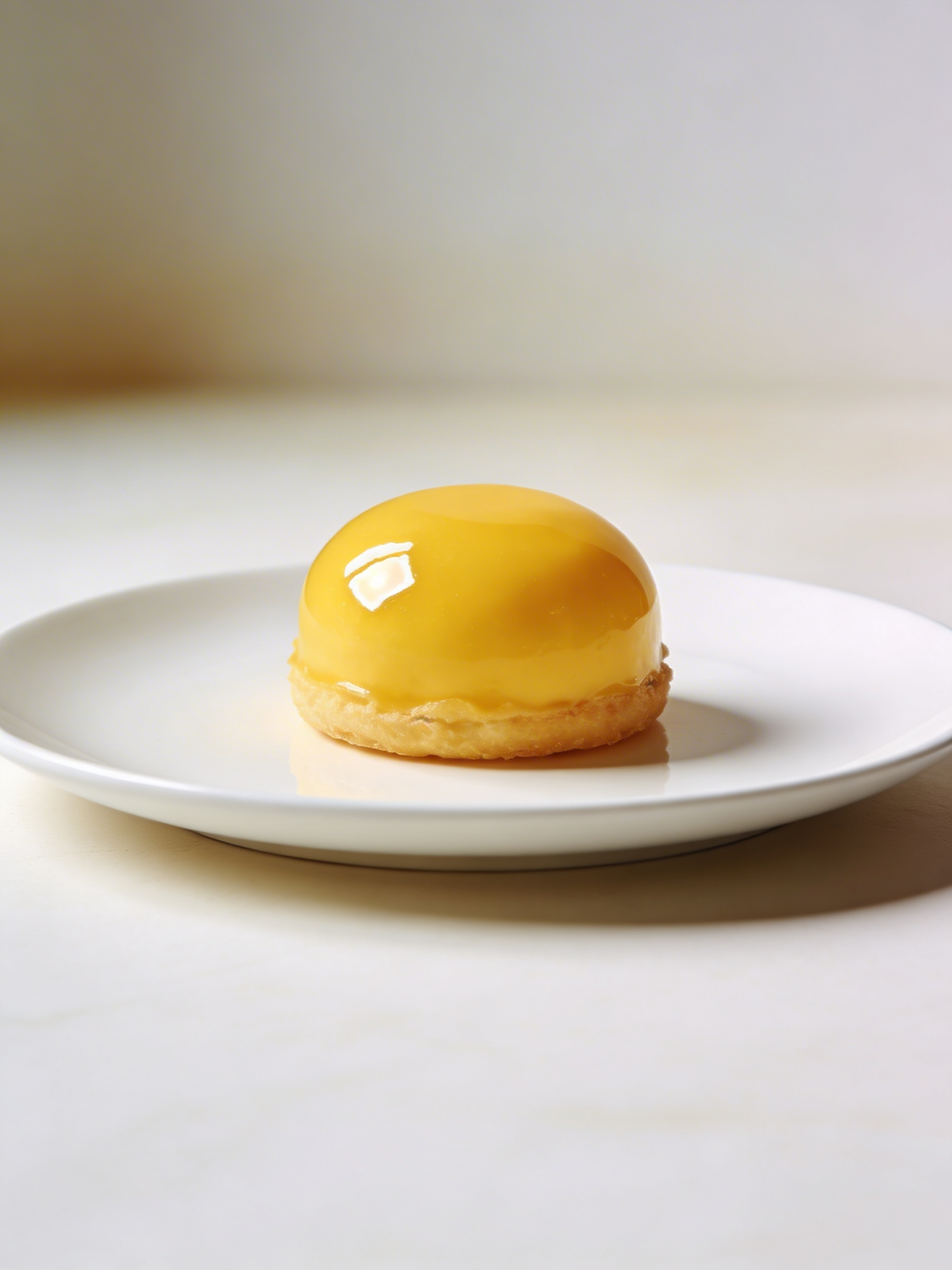 A yellow pastry or dessert with glossy topping, minimal food styling, no text.