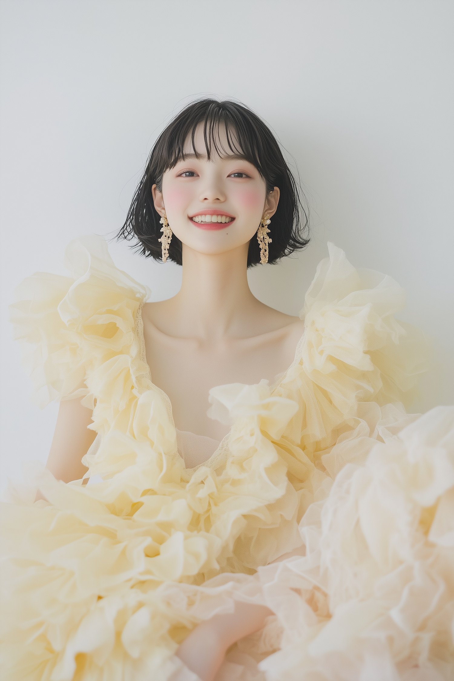A cheerful woman in a ruffled yellow dress and gold earrings, smiling brightly against a minimal white background.