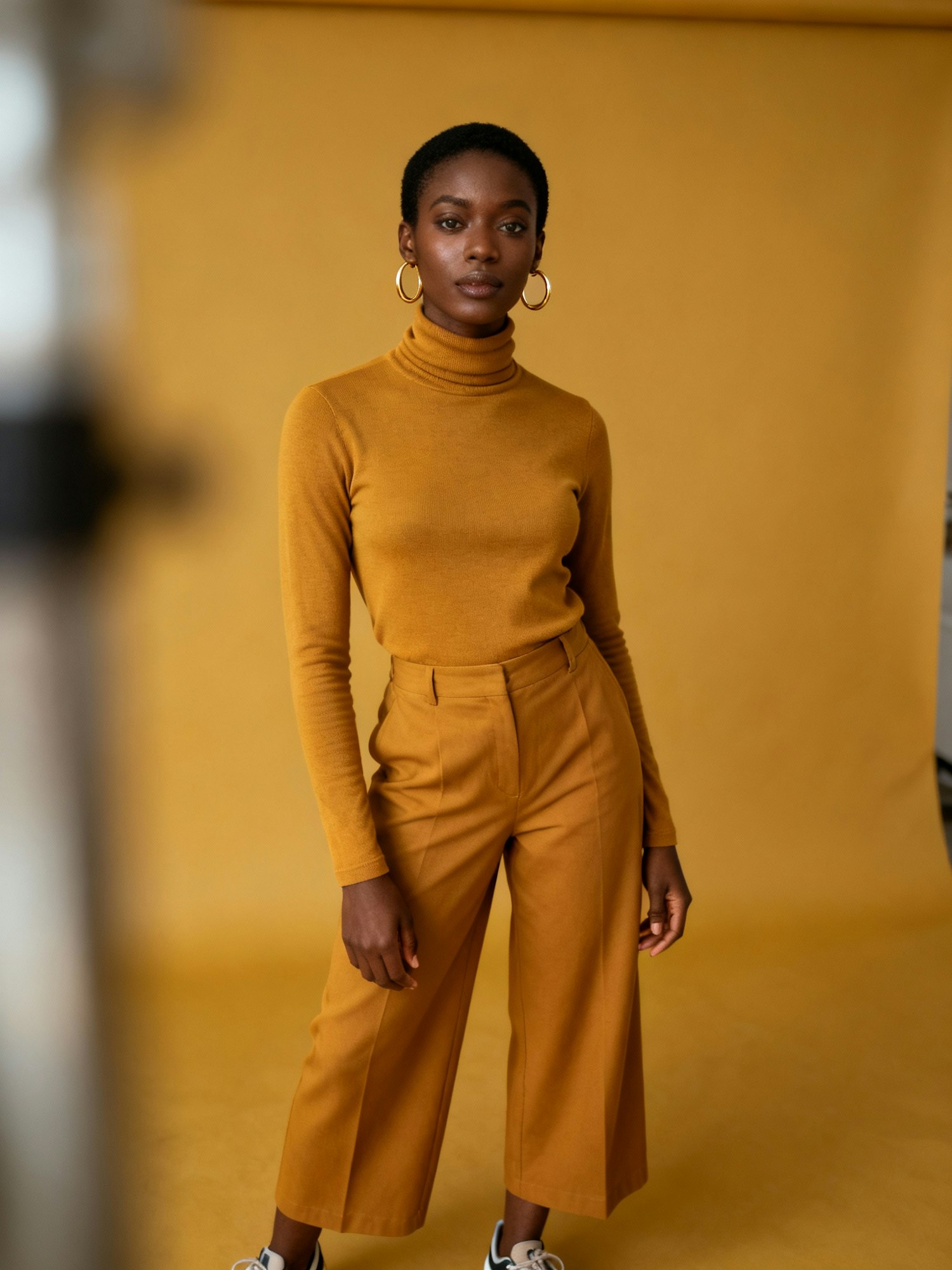Waist-up, high-definition portrait of a stylish Black woman standing against a clean, minimalist backdrop. She wears a modern mustard-colored turtleneck paired with wide-leg trousers in matching tones, creating a sleek, monochromatic silhouette. Mustard sneakers peek out subtly, maintaining the cohesive color palette. Her short hair is styled simply, and she gazes confidently at the camera. Her melanin glows under soft, even lighting. Accessories include small and large gold hoop earrings, adding subtle shine and personality. The matching mustard background enhances depth and texture, emphasizing the tonal layers of her outfit. The overall mood is minimalist, modern, and editorially striking—perfect for a fashion portrait or Afro-fusion identity showcase.