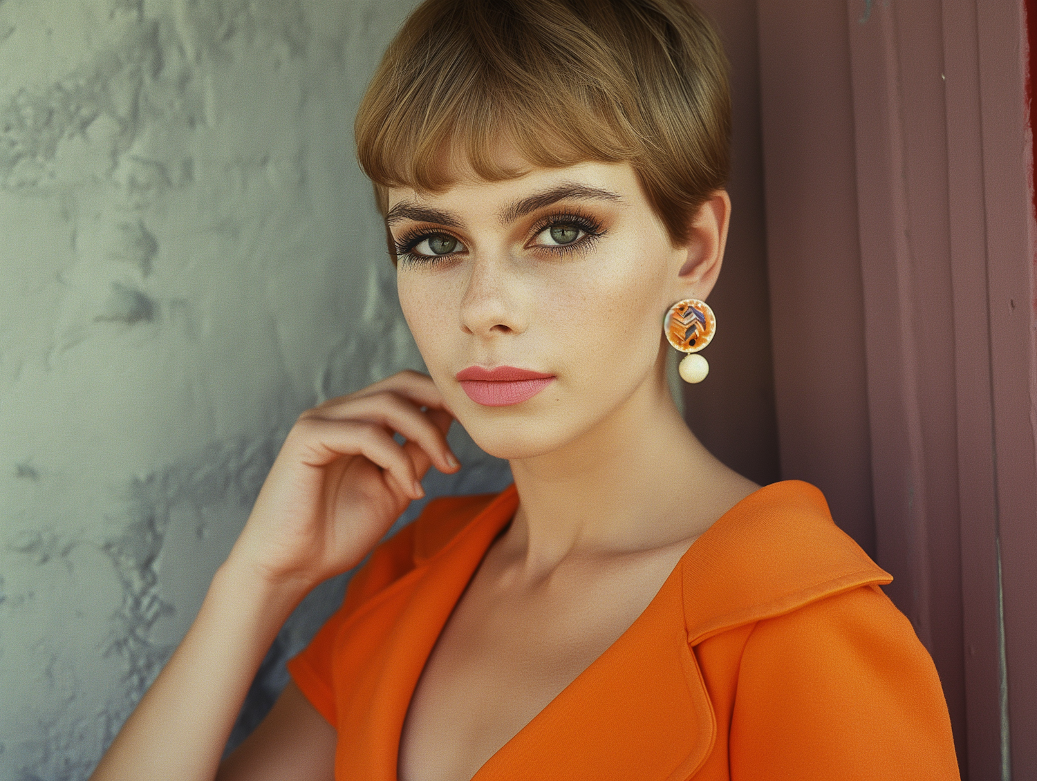 Elegant woman in orange dress with striking green eyes and geometric earrings, exuding grace and sophistication.