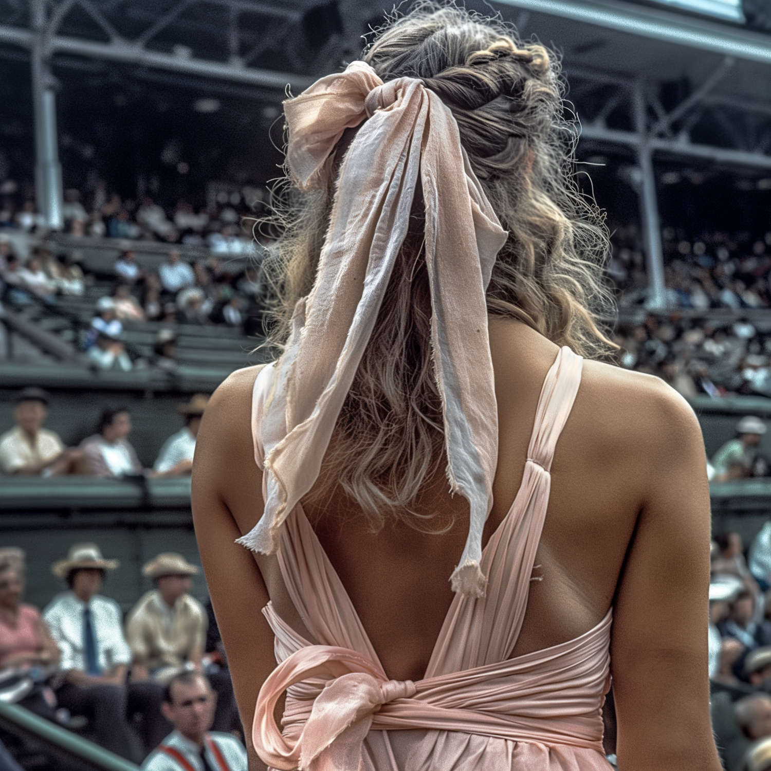 Woman with wavy hair and pink ribbon in a stadium, wearing a light pink dress. Crowd in background, creating a lively atmosphere.