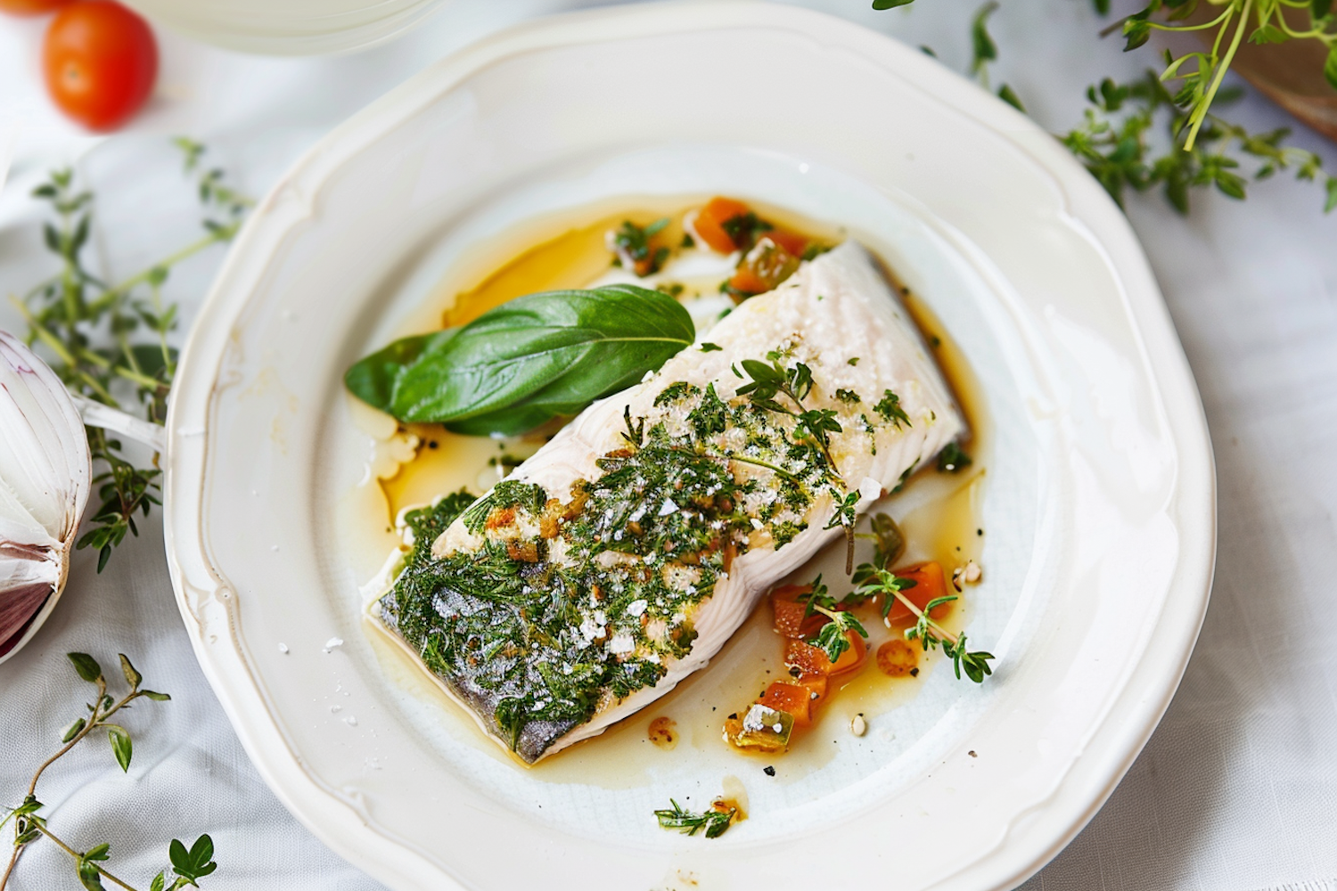 Deliciously garnished fish with herbs and sauce, served with diced vegetables on a white plate. Fresh and vibrant presentation.
