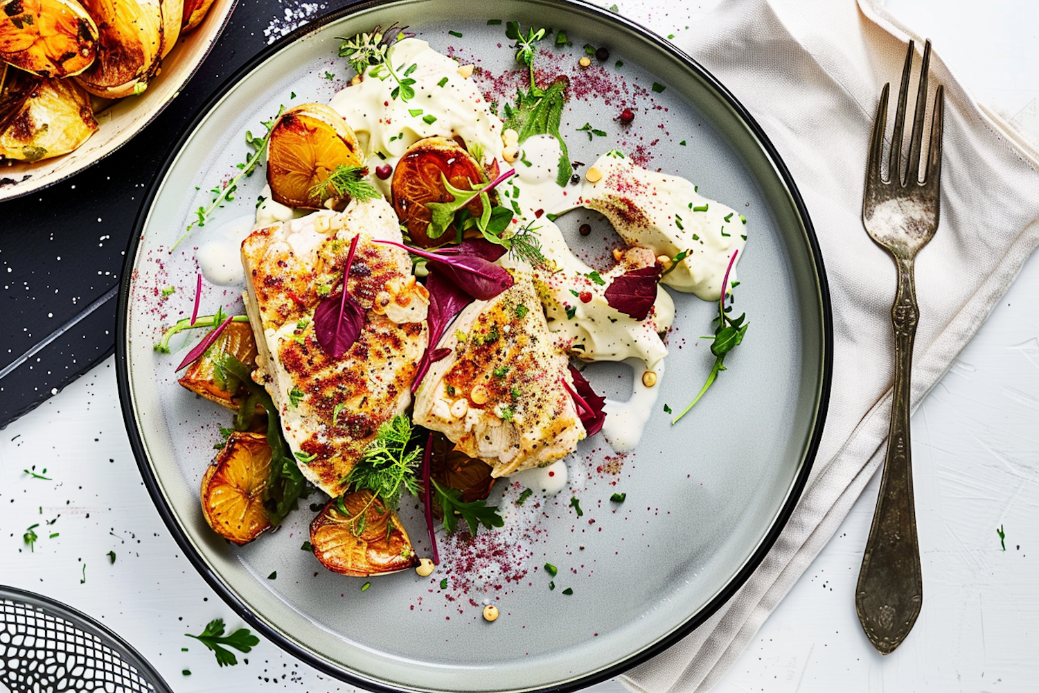 Grilled chicken with roasted vegetables and creamy sauce, garnished with fresh greens and spices on a stylish plate.