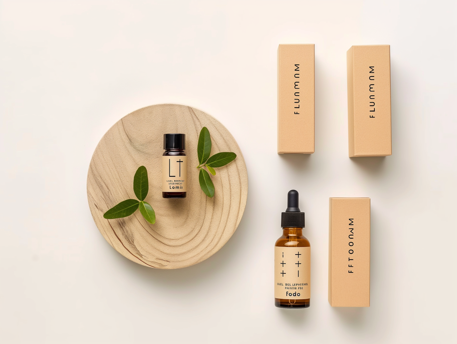 Minimalist skincare product display with amber bottles and beige packaging on a wooden plate and light background.