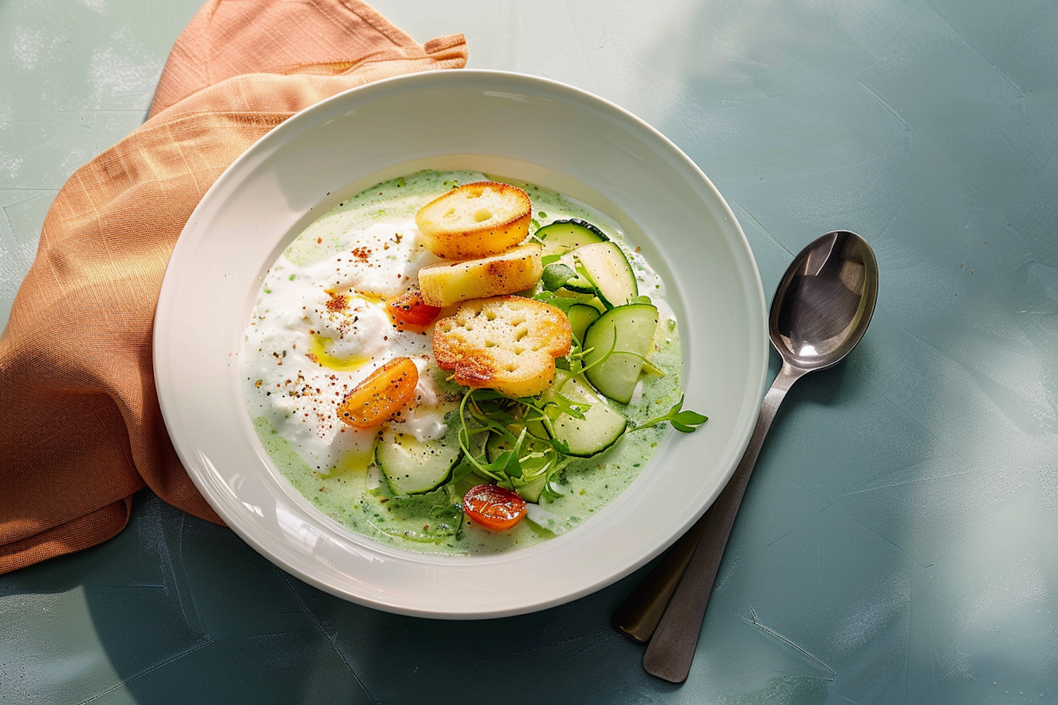 Creamy green soup with cucumber, tomatoes, croutons, and cheese in a white bowl on a blue surface with a spoon and orange napkin.