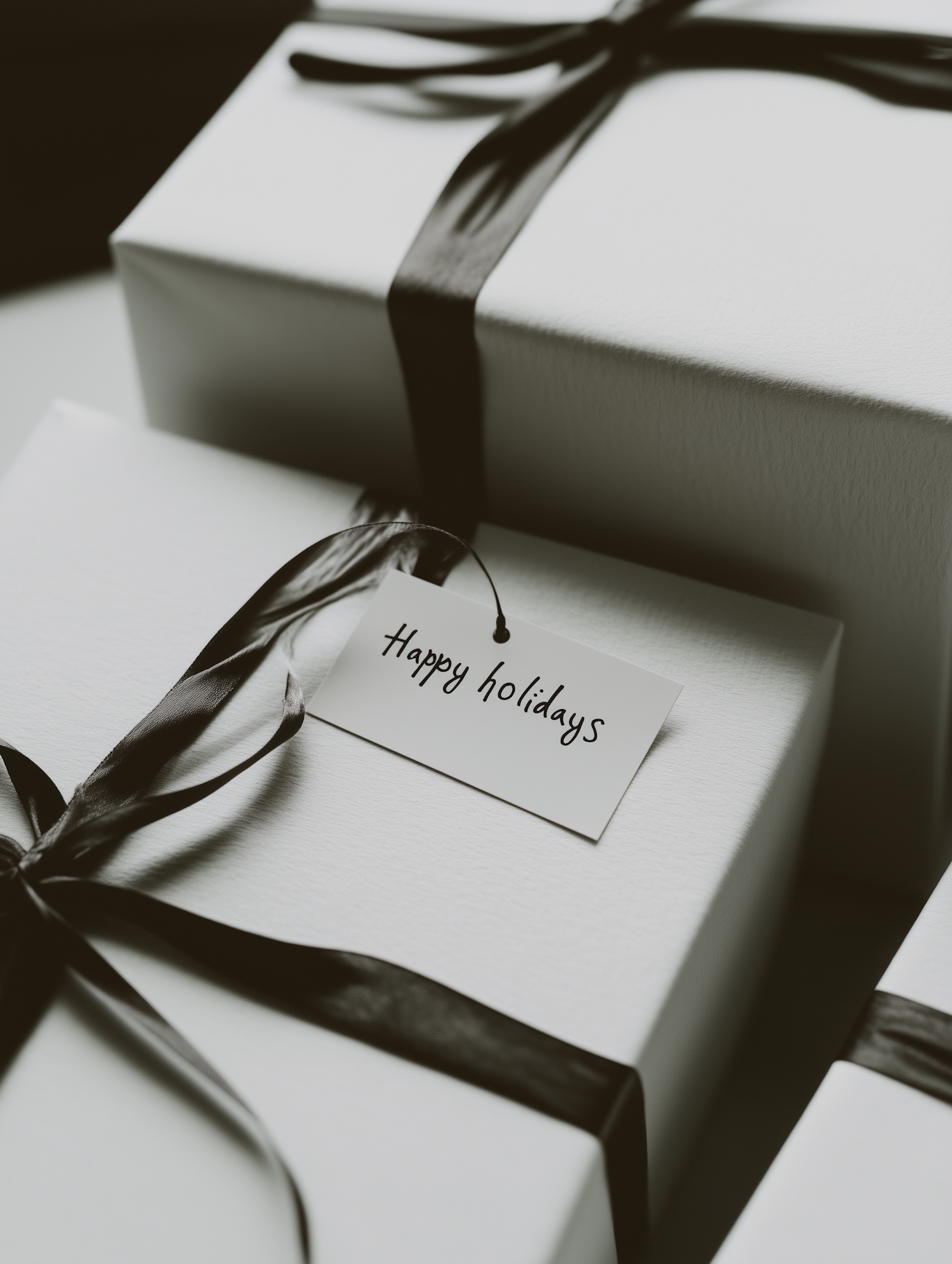 Elegant white gift boxes with black ribbons and a 'Happy holidays' tag, perfect for festive celebrations and minimalist aesthetics.