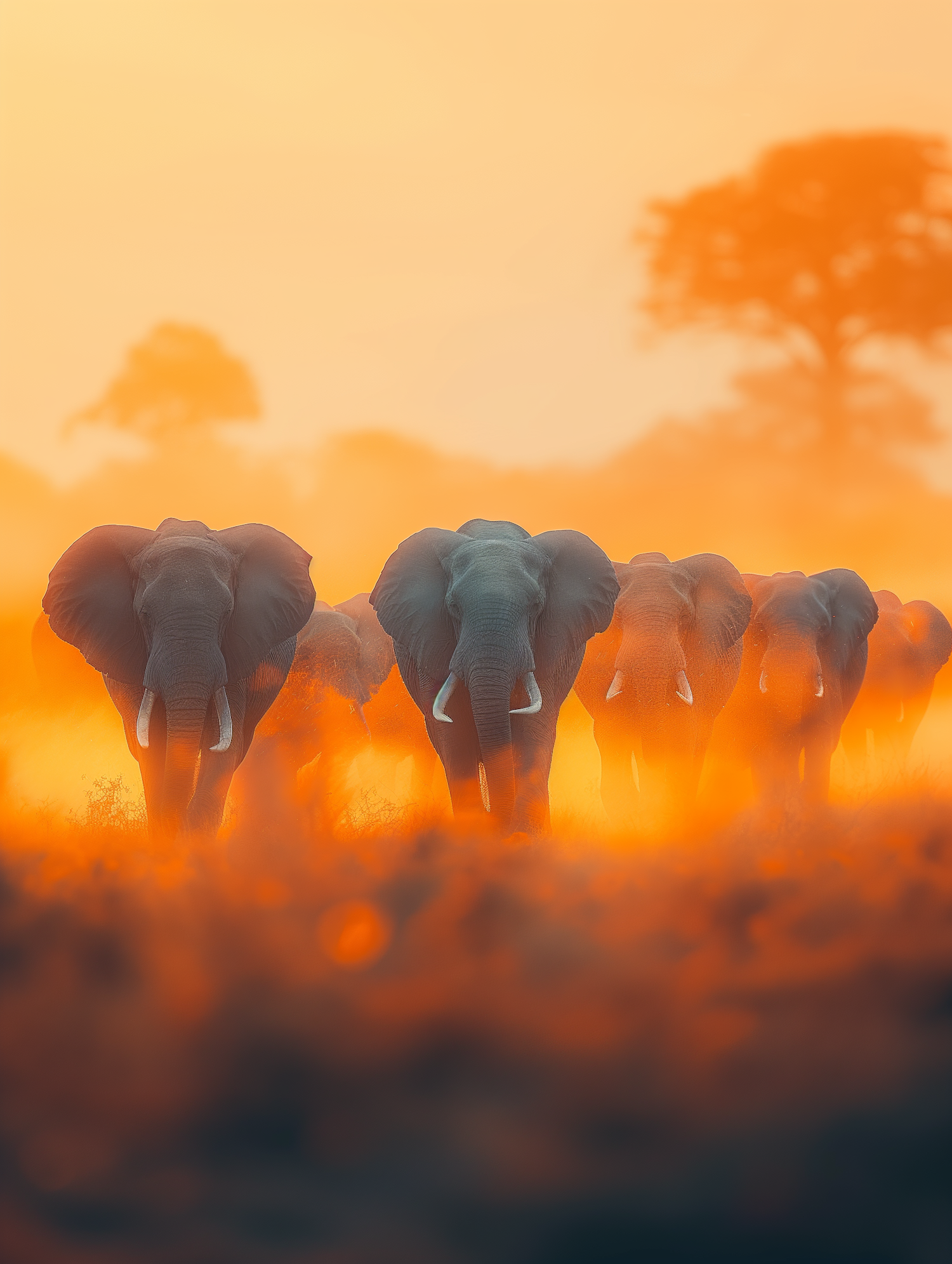 A majestic herd of elephants walks in golden light, creating a stunning silhouette against a warm, blurred savannah backdrop.