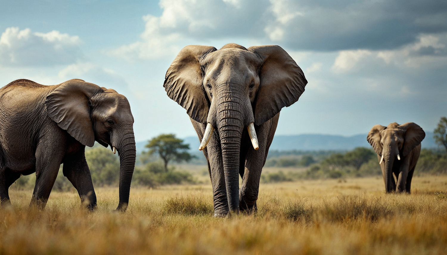 Three elephants walk majestically across a sunlit savanna, with golden grasses and a backdrop of distant hills and clouds.