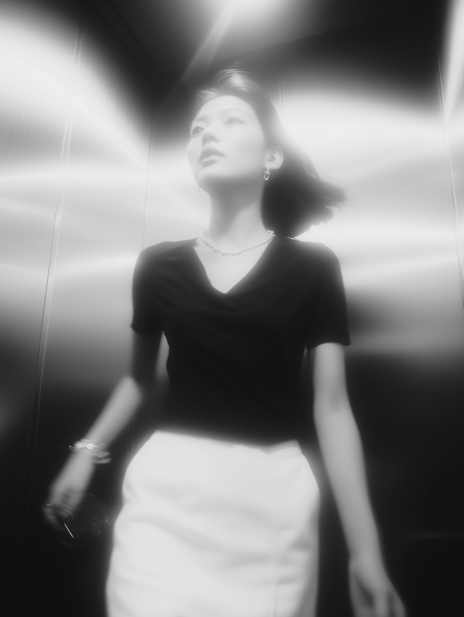 A monochrome image of a woman in an elevator, wearing a black top and white skirt, with soft lighting and a surreal, glowing effect.