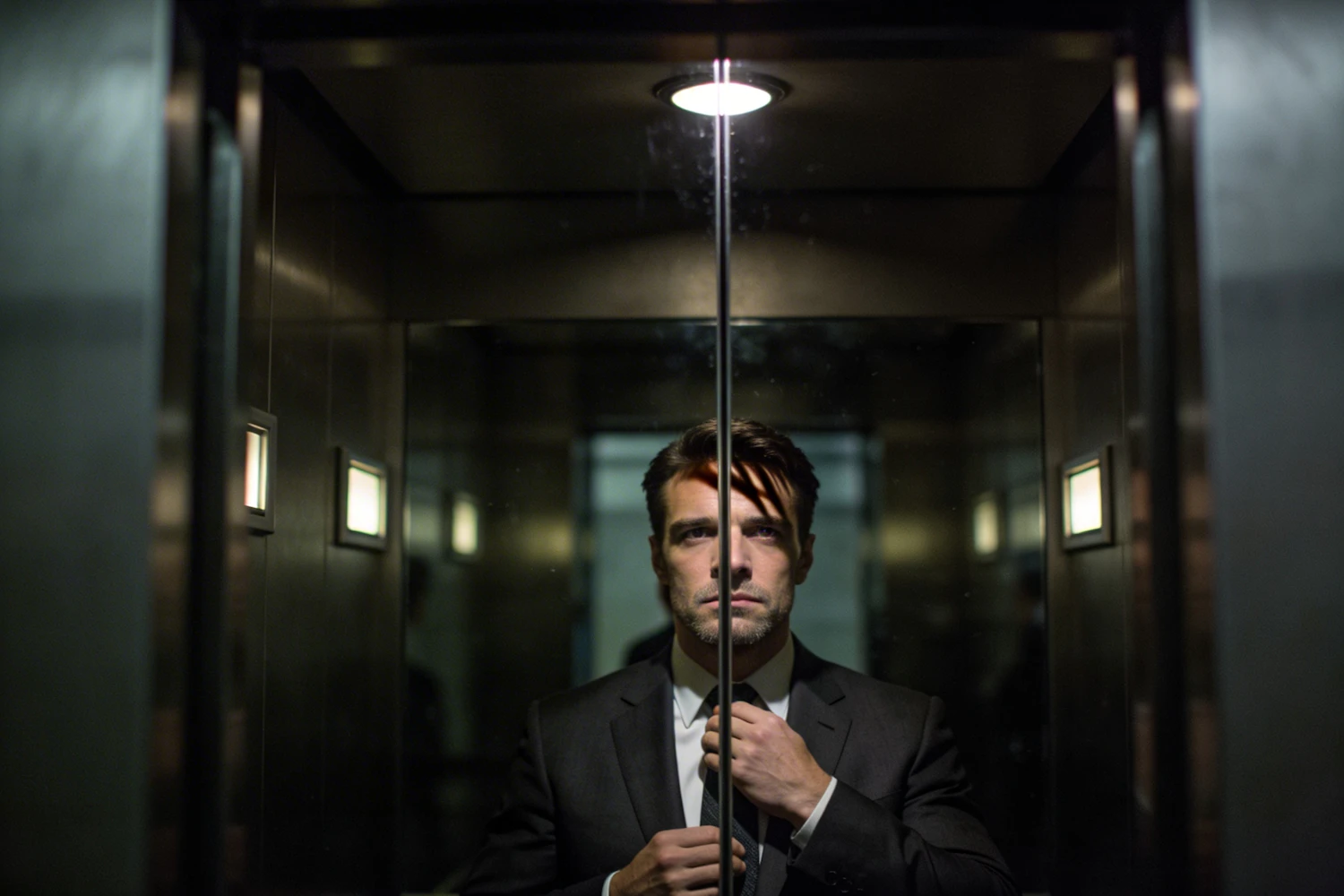 man adjusting his tie in a darkened elevator mirror, reflection partially obscured by metal seam, dim overhead light creating shadows under the eyes, contained tension, seconds before doors open