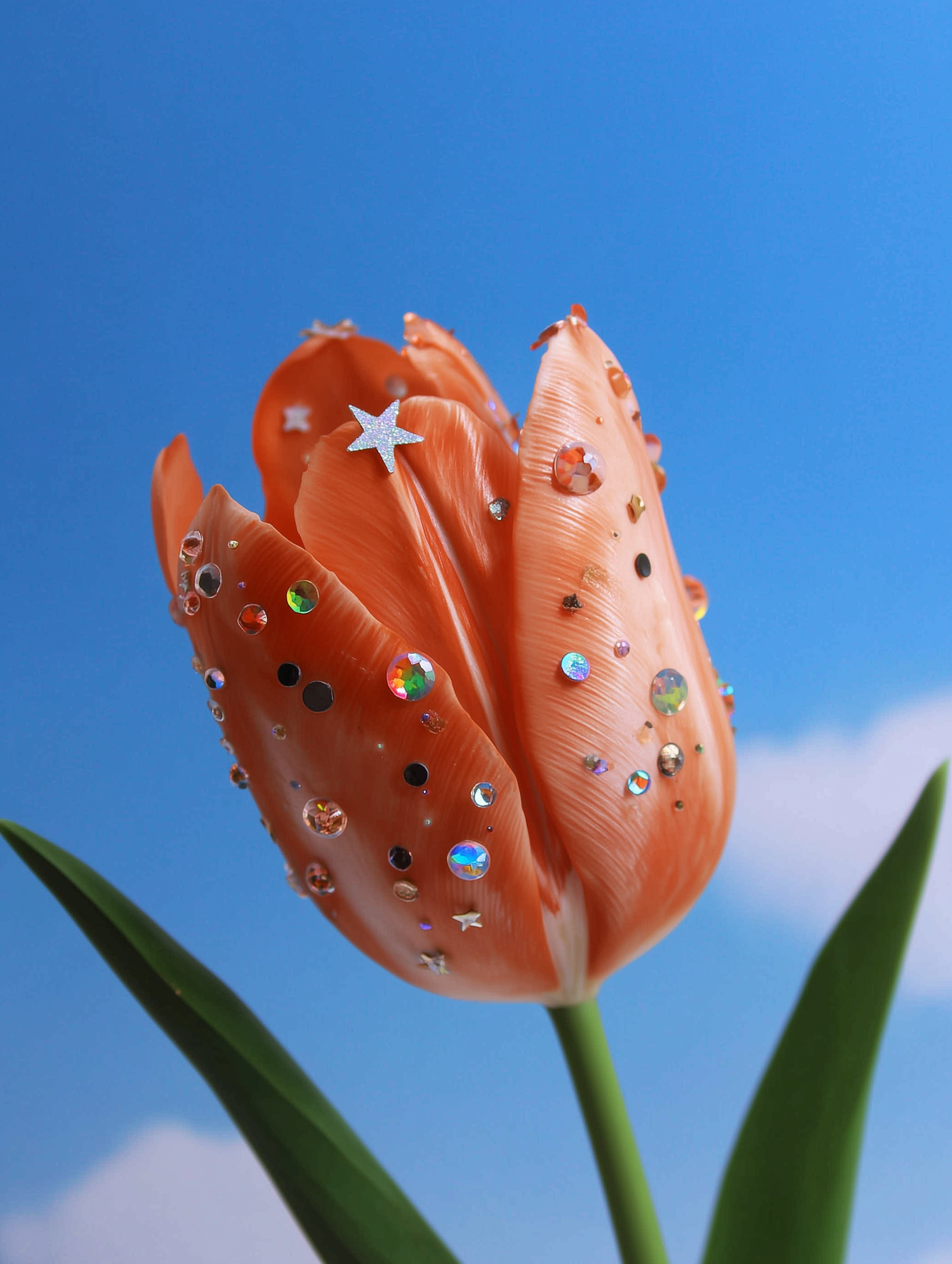 A close-up of an orange tulip decorated with rhinestones and stars, set against a bright blue sky with soft clouds.