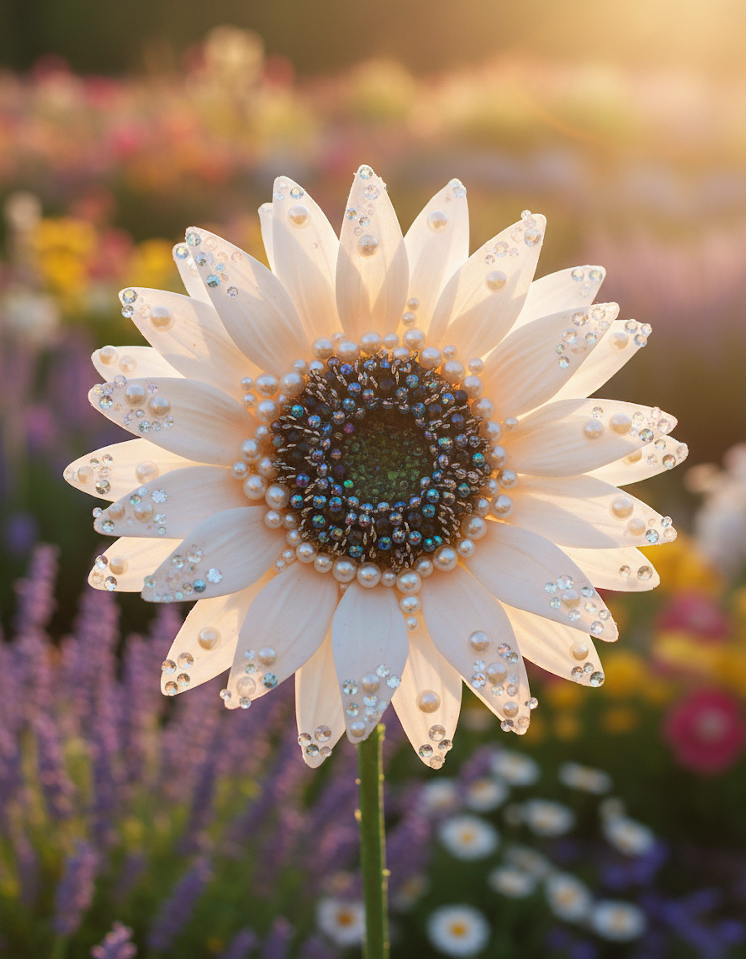 A sunflower adorned with pearls and gems stands out against a vibrant, sunlit garden background.