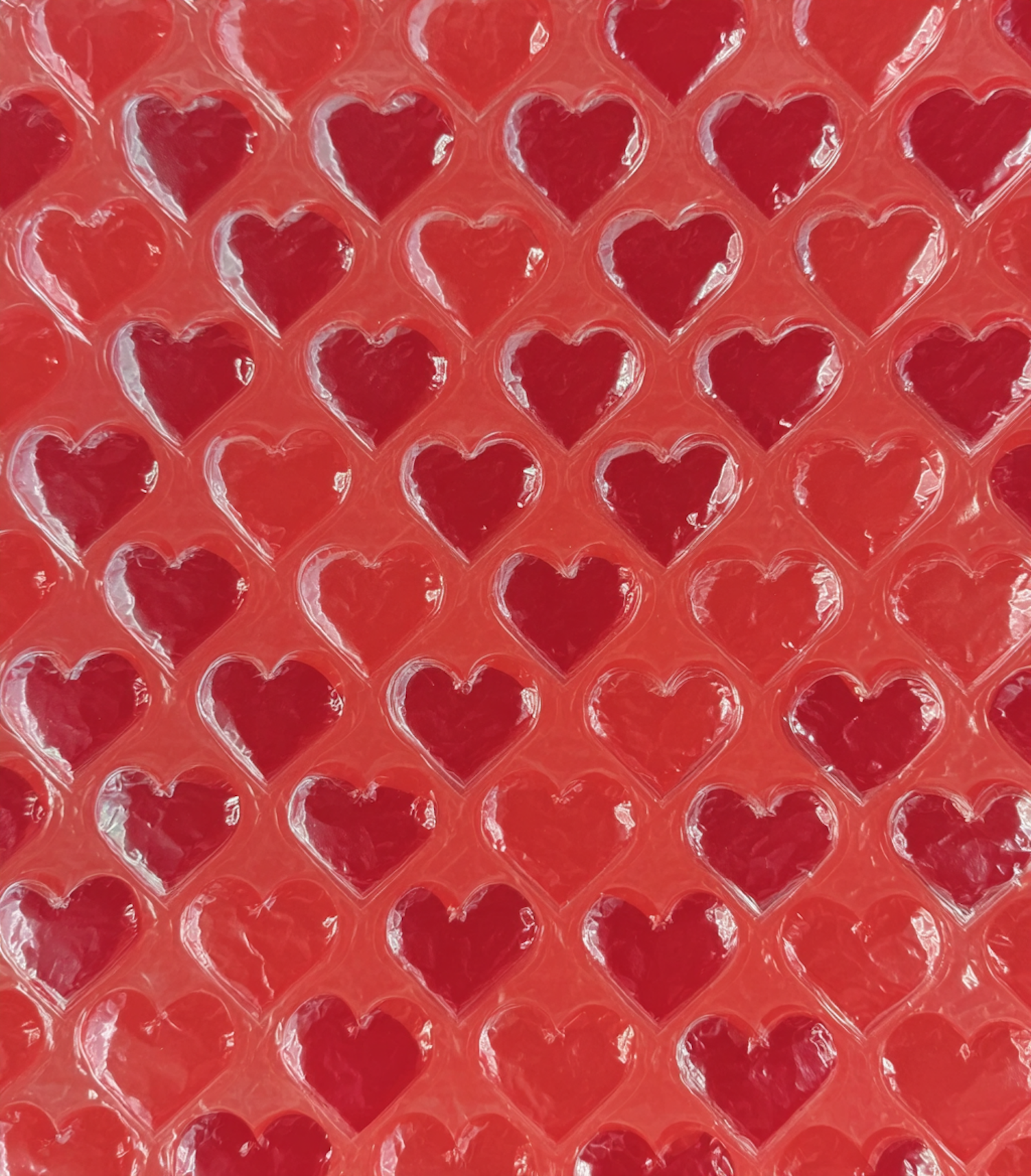 A vibrant red textured surface with glossy embossed heart shapes, creating a striking and uniform pattern.