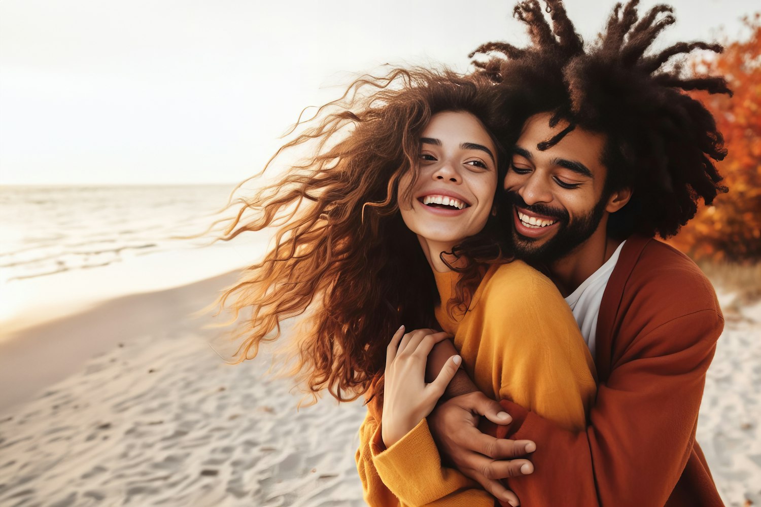 Happy couple embracing on a beach at sunset, with autumn colors and joyful expressions.