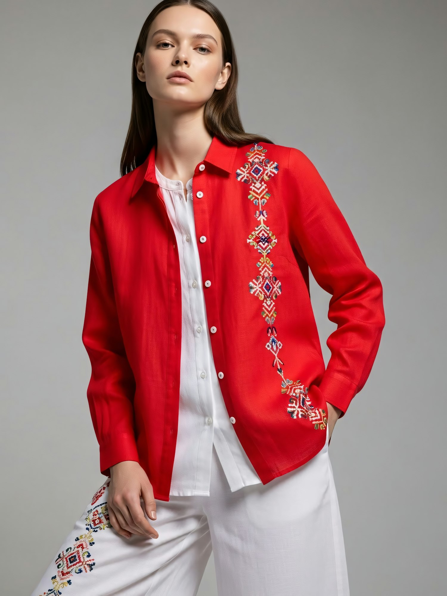 A woman in a red embroidered shirt and white trousers with matching patterns, showcasing a stylish and artistic outfit.