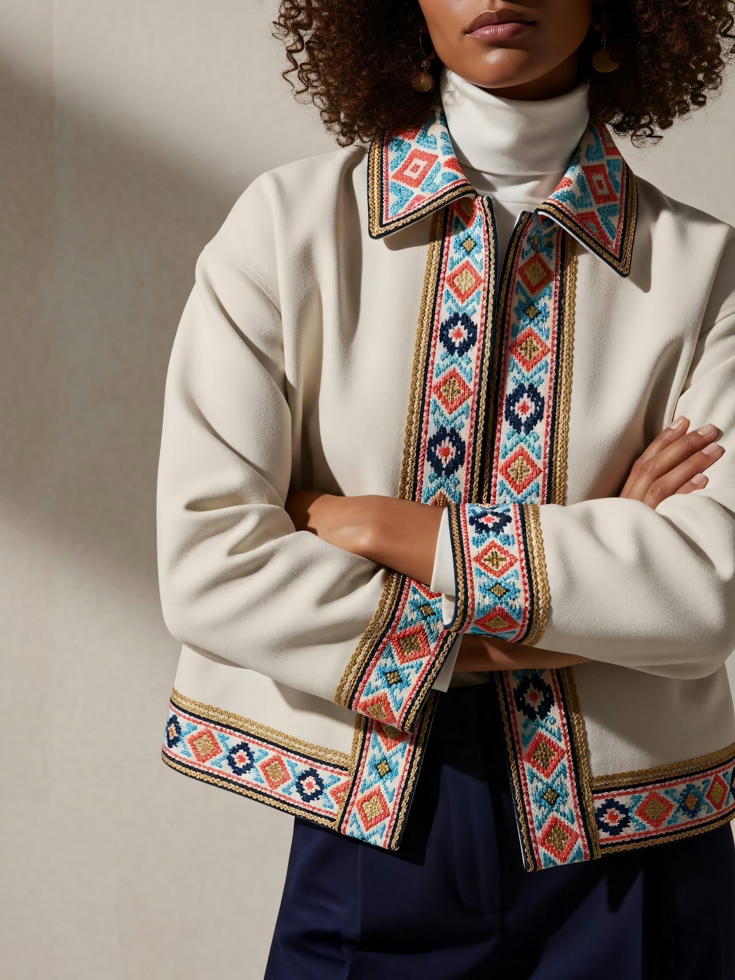 A cream jacket with vibrant geometric embroidery, worn by a person with curly hair and gold earrings, set against a neutral background.