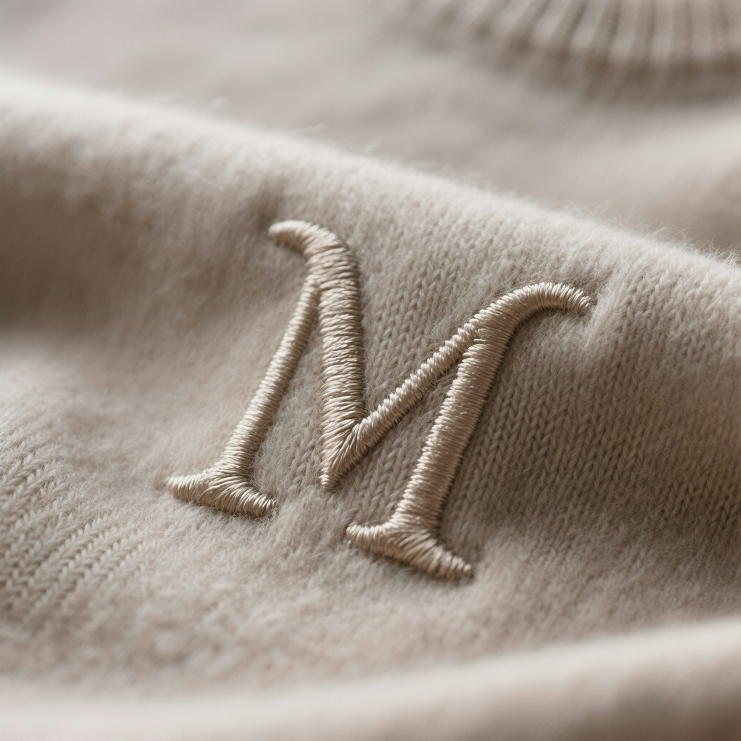 Close-up of a beige fabric with an embroidered letter 'M', showcasing fine stitching and soft texture, perfect for personalized apparel.