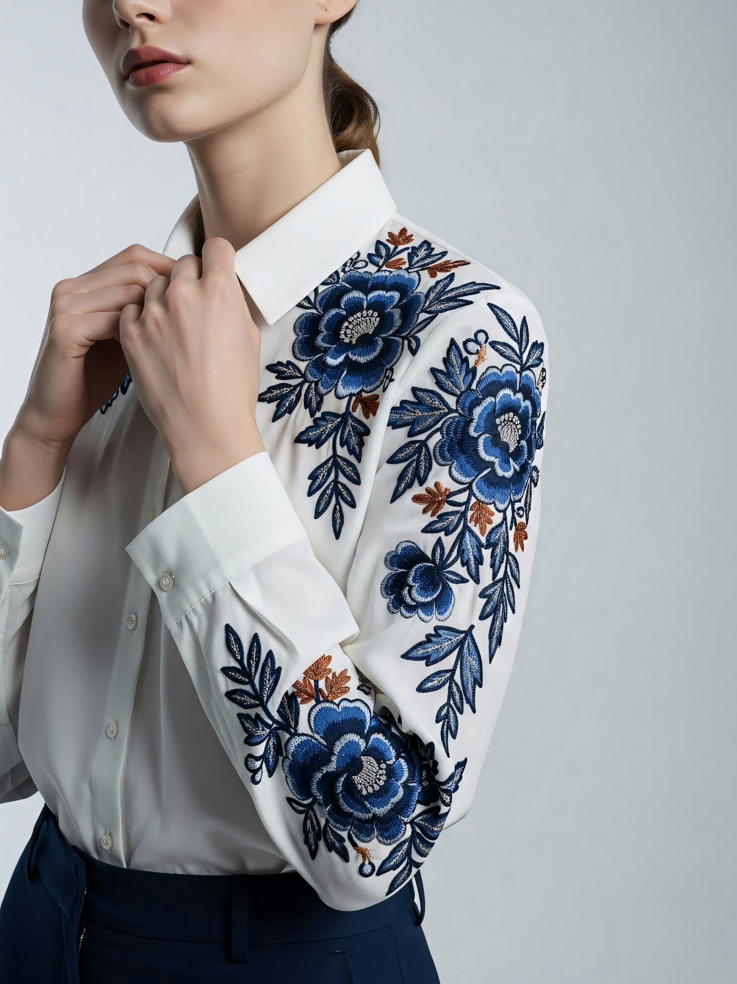 Elegant white shirt with blue floral embroidery, showcasing intricate details and a stylish design, perfect for a sophisticated look.
