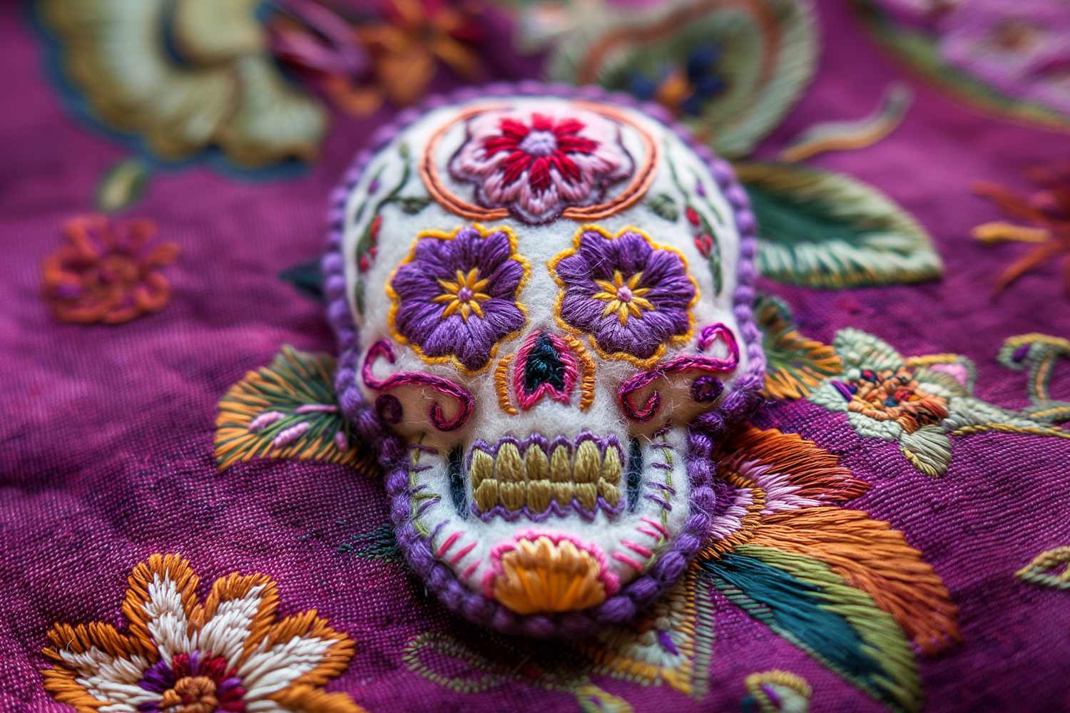 Colorful embroidered skull on vibrant fabric with floral patterns, showcasing intricate designs and festive colors.