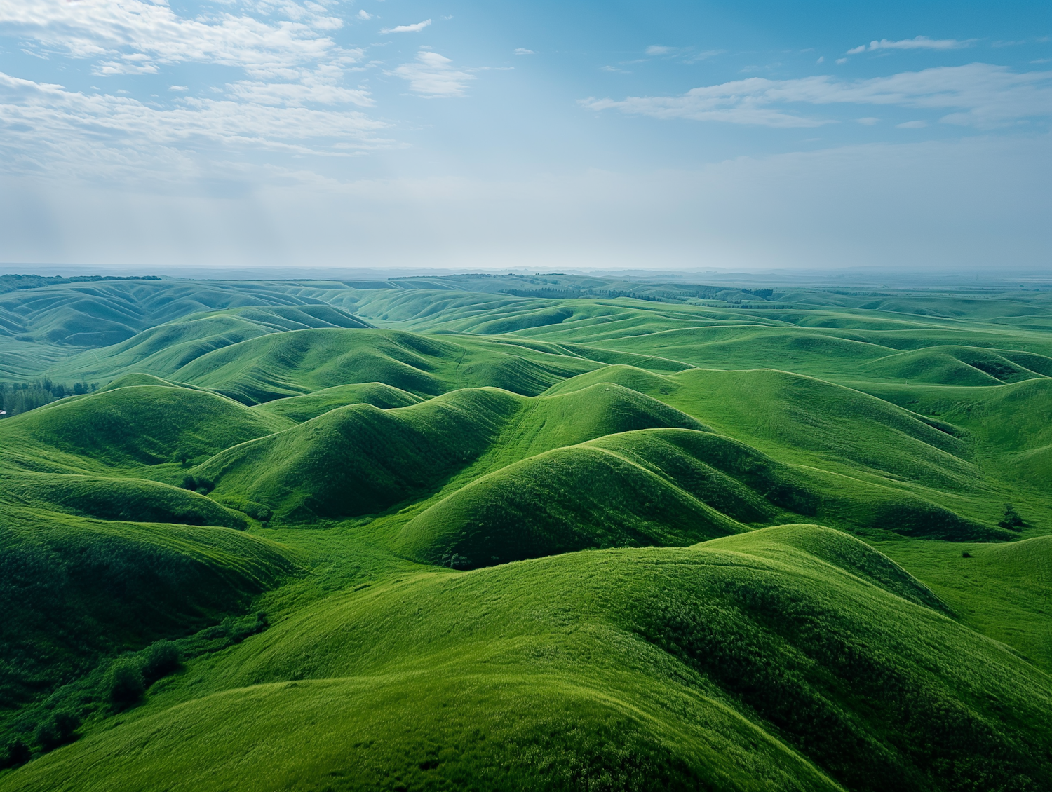 Expansive rolling green hills under a blue sky with wispy clouds, creating a serene and tranquil landscape.