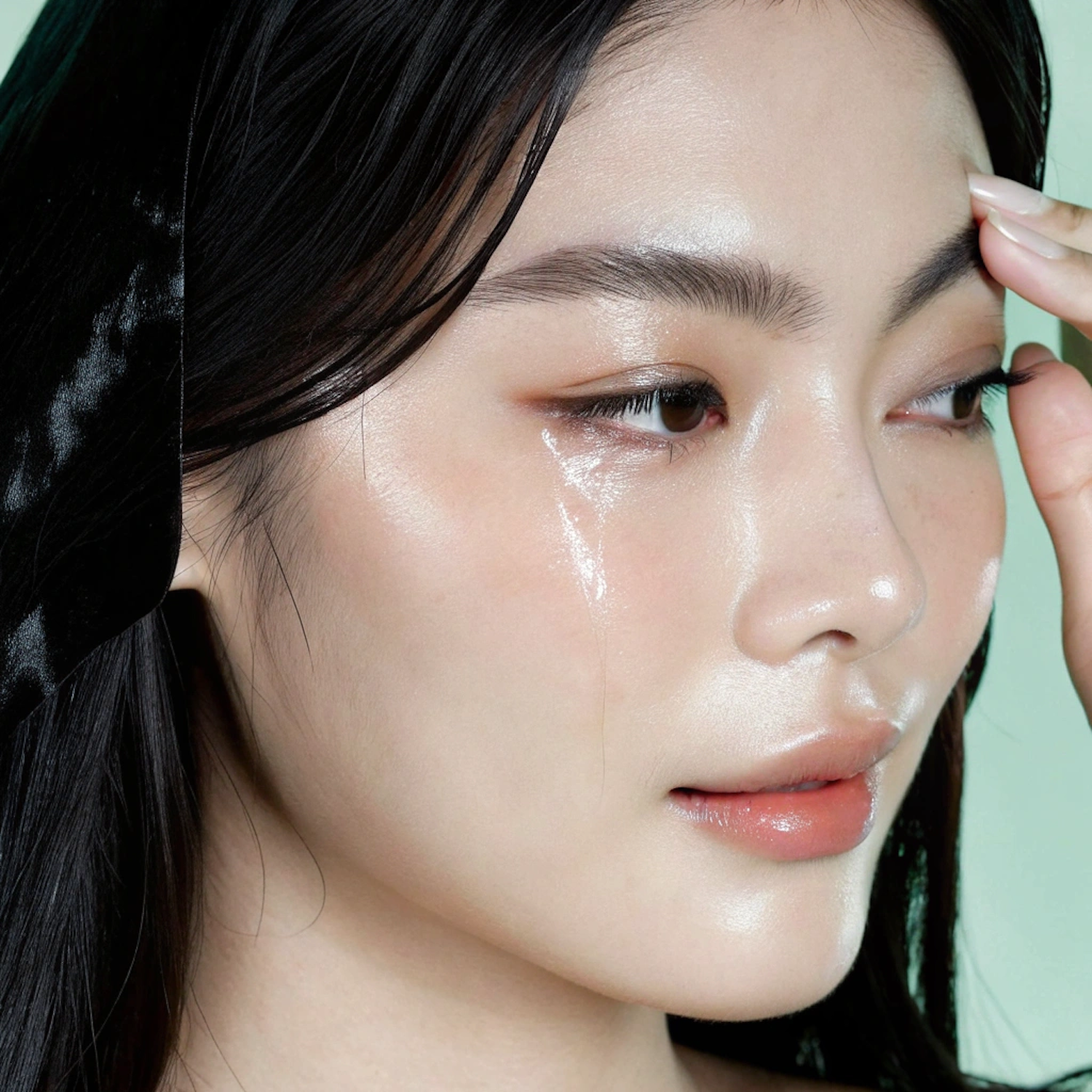 Close-up of a woman with dewy skin, glossy lips, and a tear on her cheek, set against a soft green background.