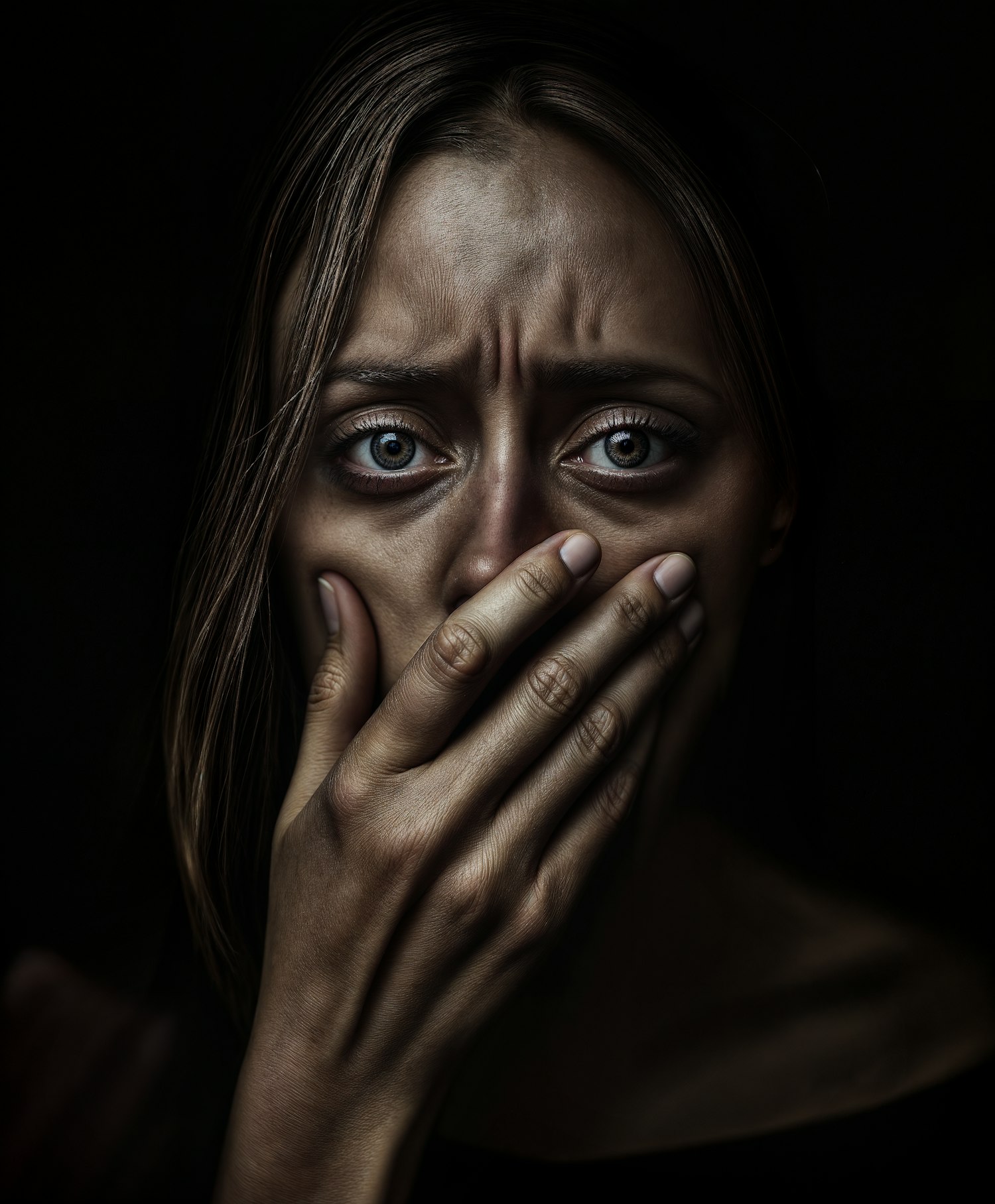 Close-up of a distressed woman with blue eyes, covering her mouth with her hand, set against a dark background.