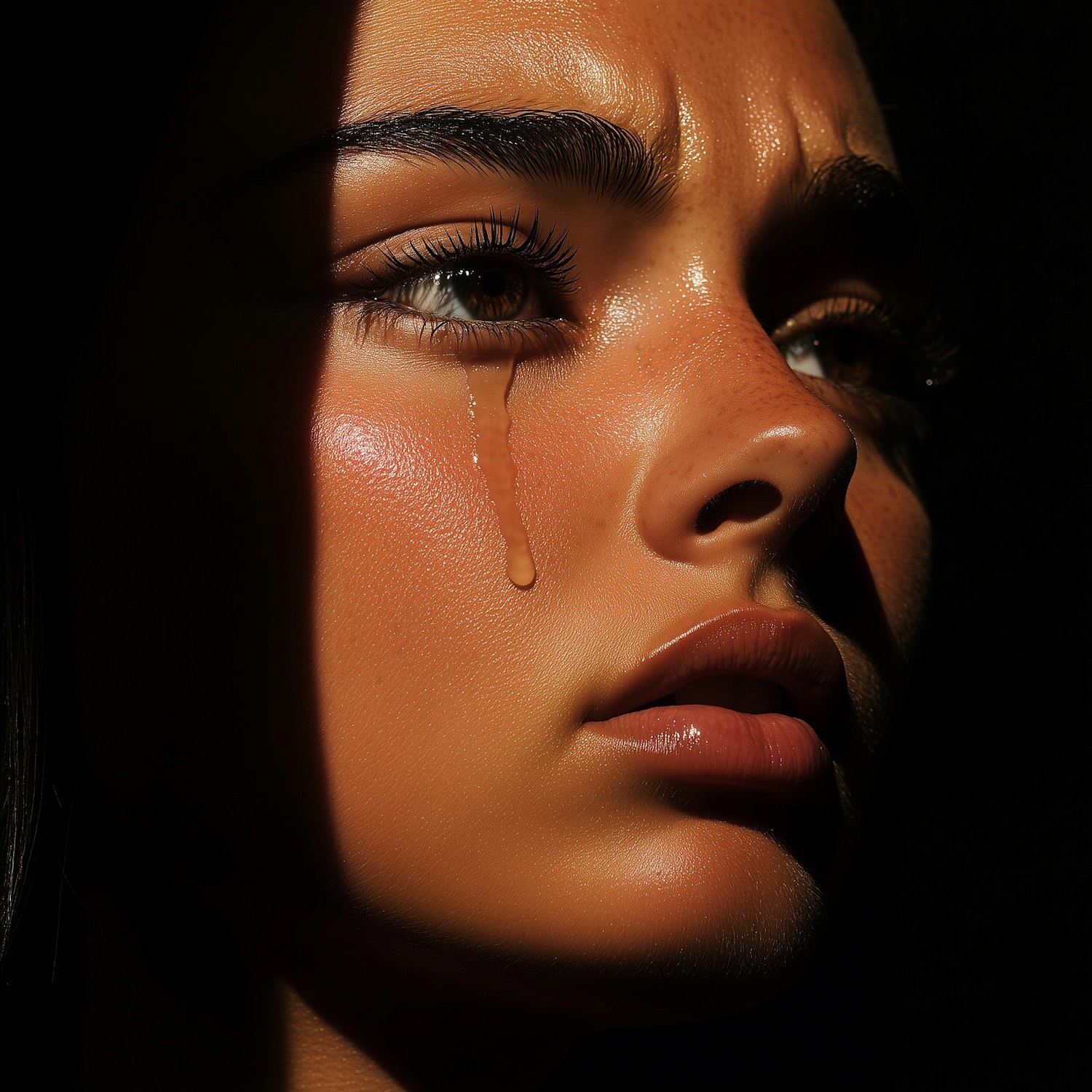 Close-up of a young woman with a tear on her cheek, dramatic lighting highlighting her intense expression and tan skin.