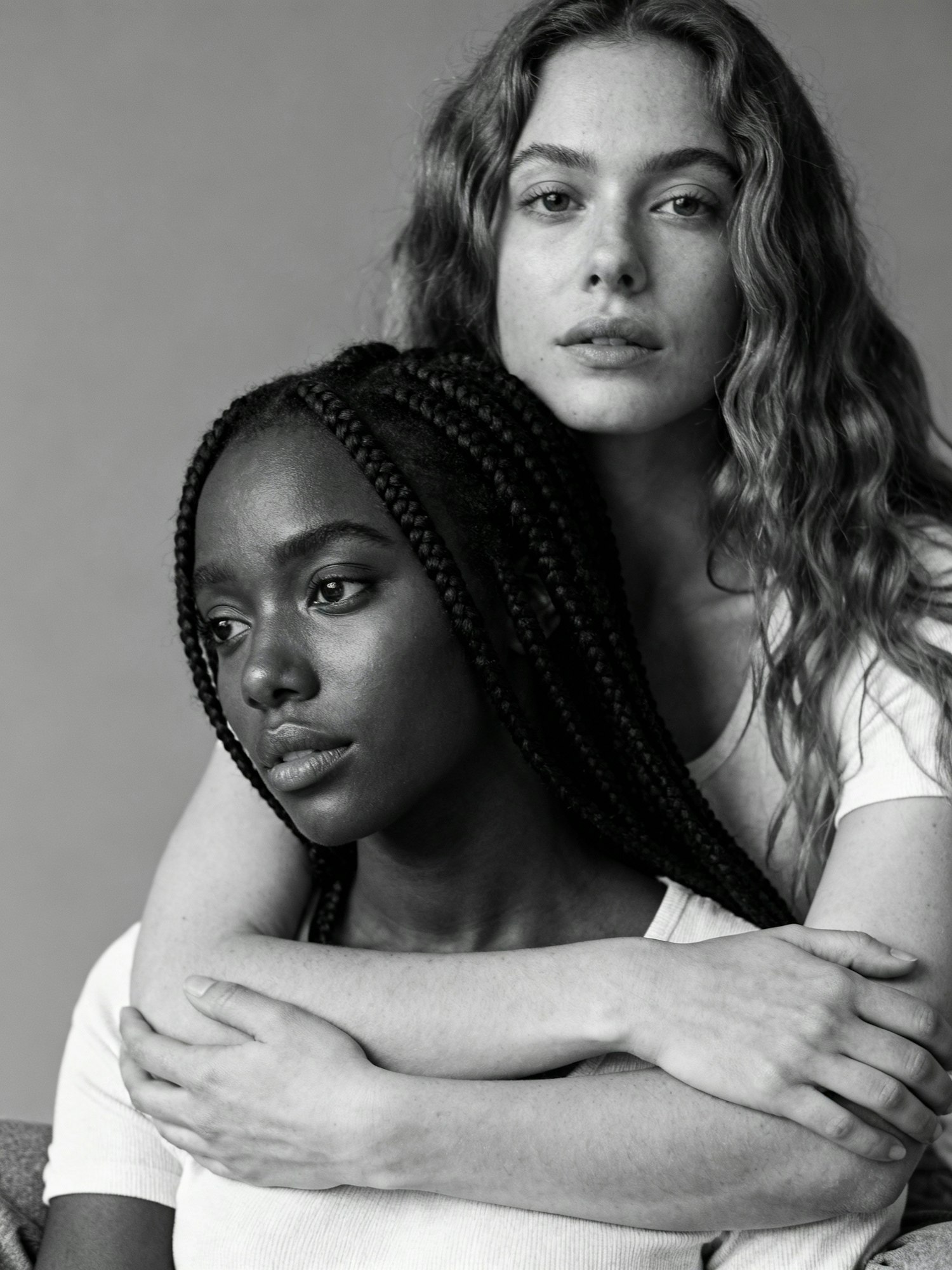 A black-and-white portrait of two women in an intimate pose, highlighting their connection and contrasting features.