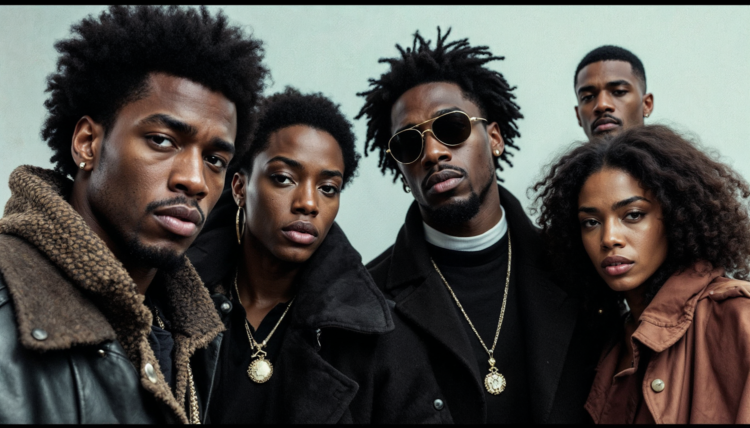 A stylish group of five Black individuals in fashionable coats and accessories, exuding confidence and unity.