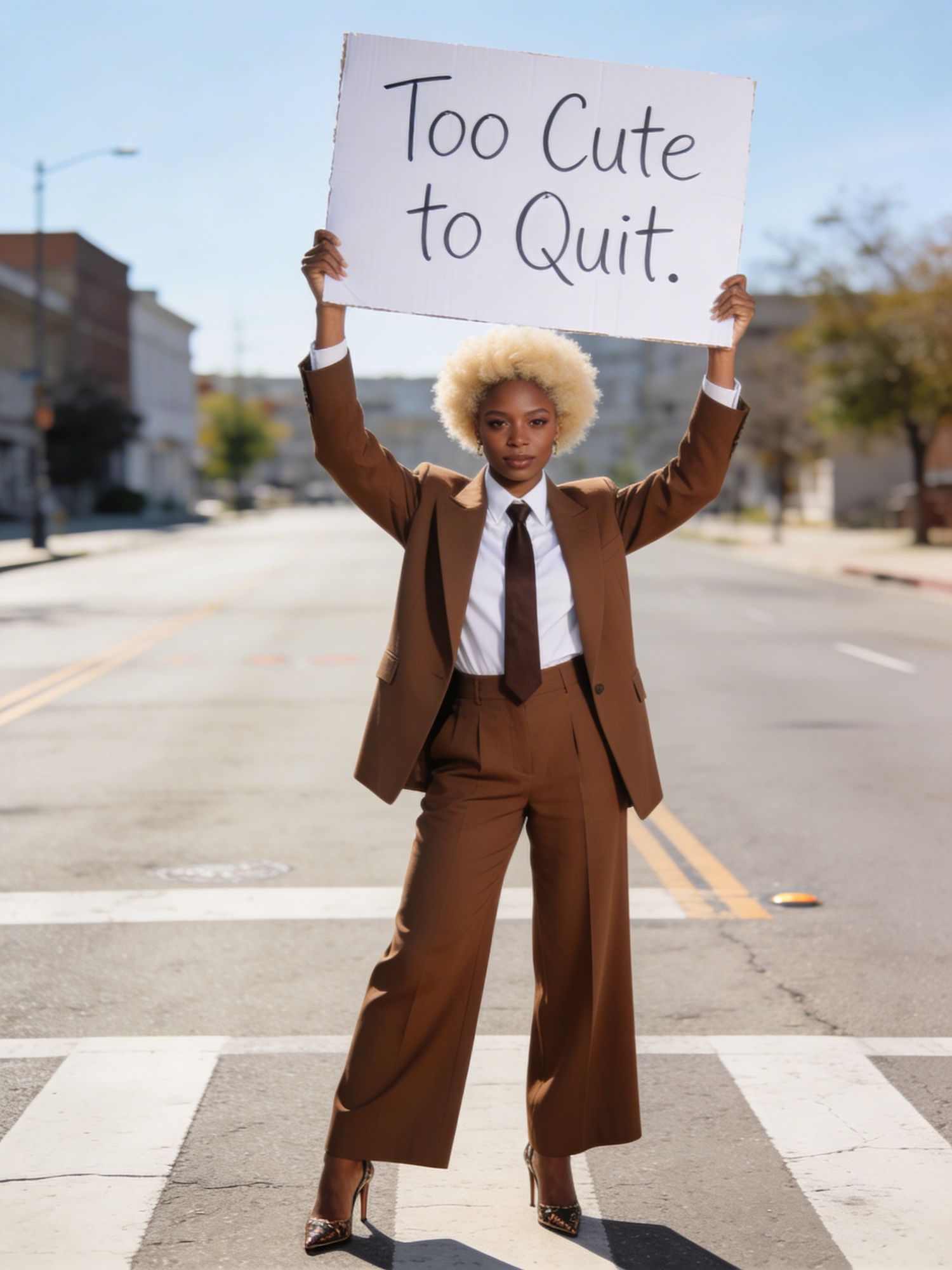 A Black woman with a blonde afro wearing an oversized brown suit with wide‑leg trousers, a crisp white shirt, stylish heels and a dark brown tie stands on a quiet crosswalk holding a neatly cut large white cardboard sign high over her head. The sign has clean handwritten text reading Too Cute to Quit