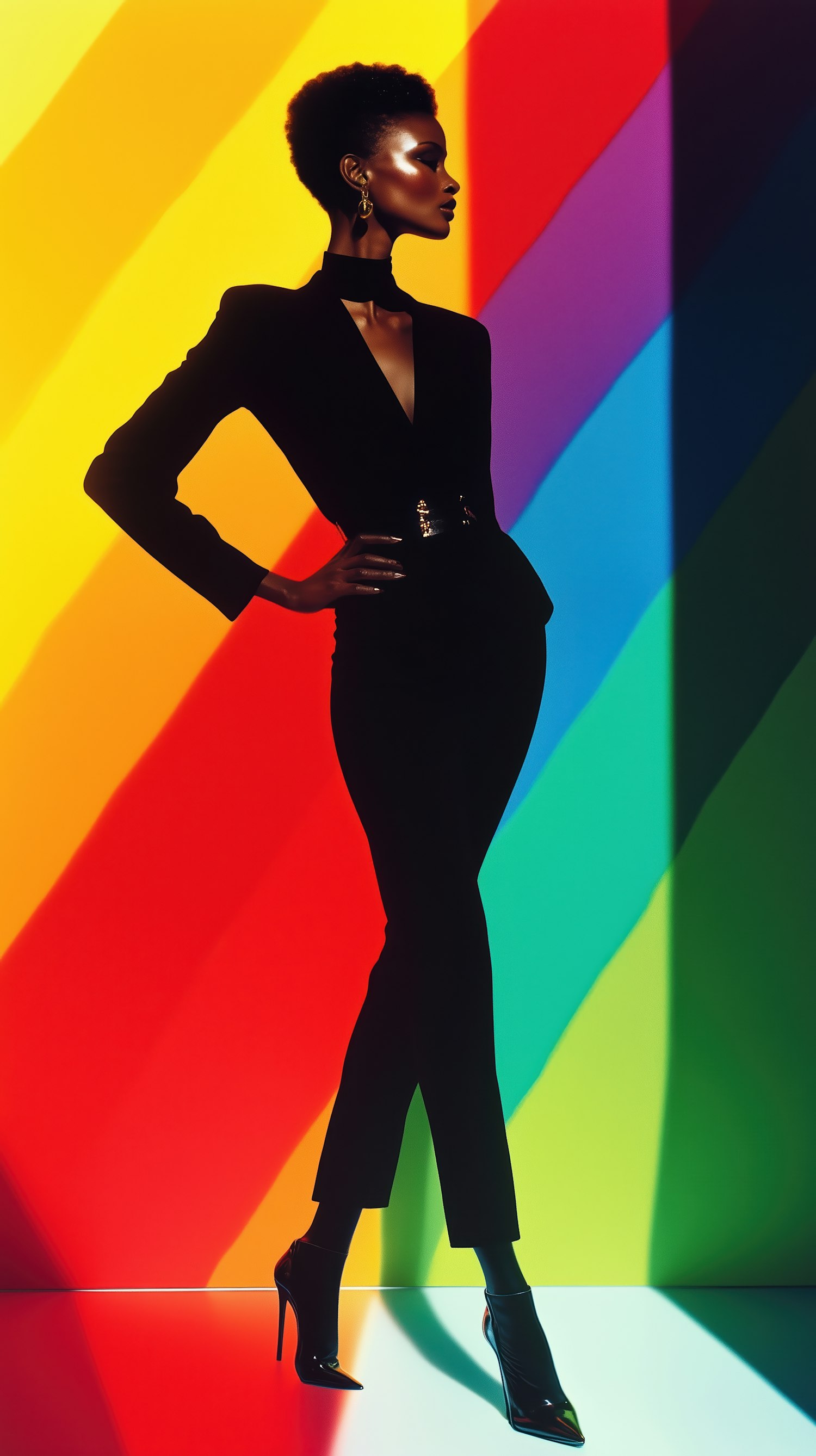 Elegant black woman in sleek outfit against vibrant rainbow background, striking a confident pose with dramatic lighting.
