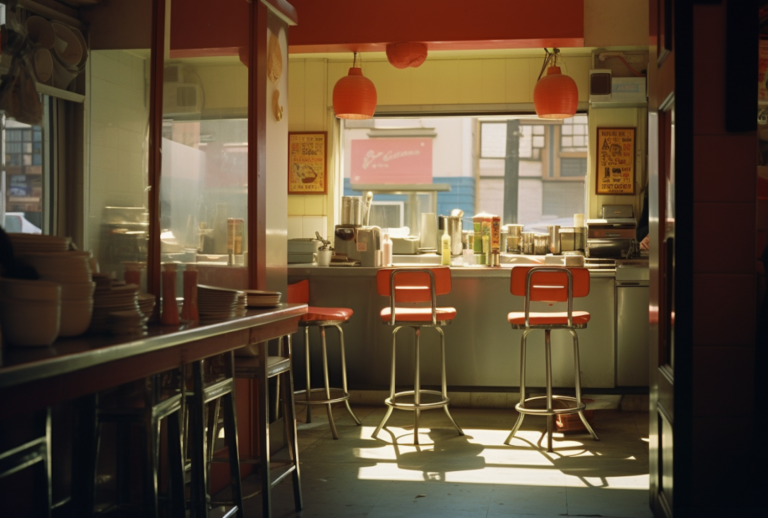 Cozy diner with red stools, vintage decor, and warm sunlight streaming through large windows, creating a nostalgic atmosphere.