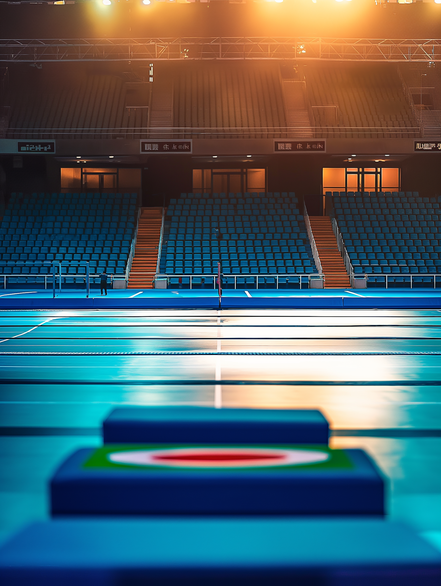 Empty indoor sports arena with blue seats, warm lighting, and a central track area. Padded mats suggest a gymnastics setup.