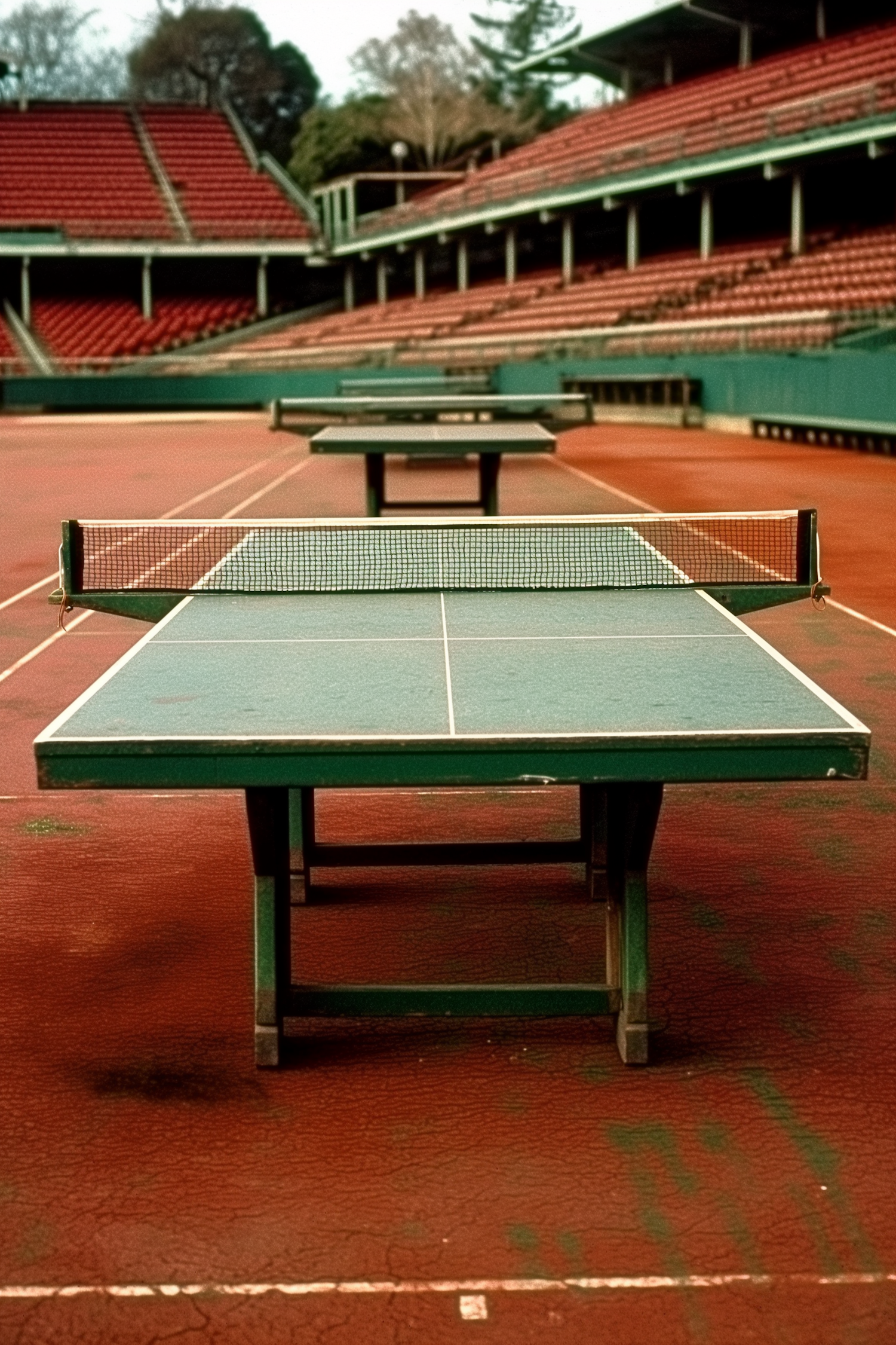 Empty ping pong tables on a red clay tennis court with stadium seating, creating a unique sports setting.