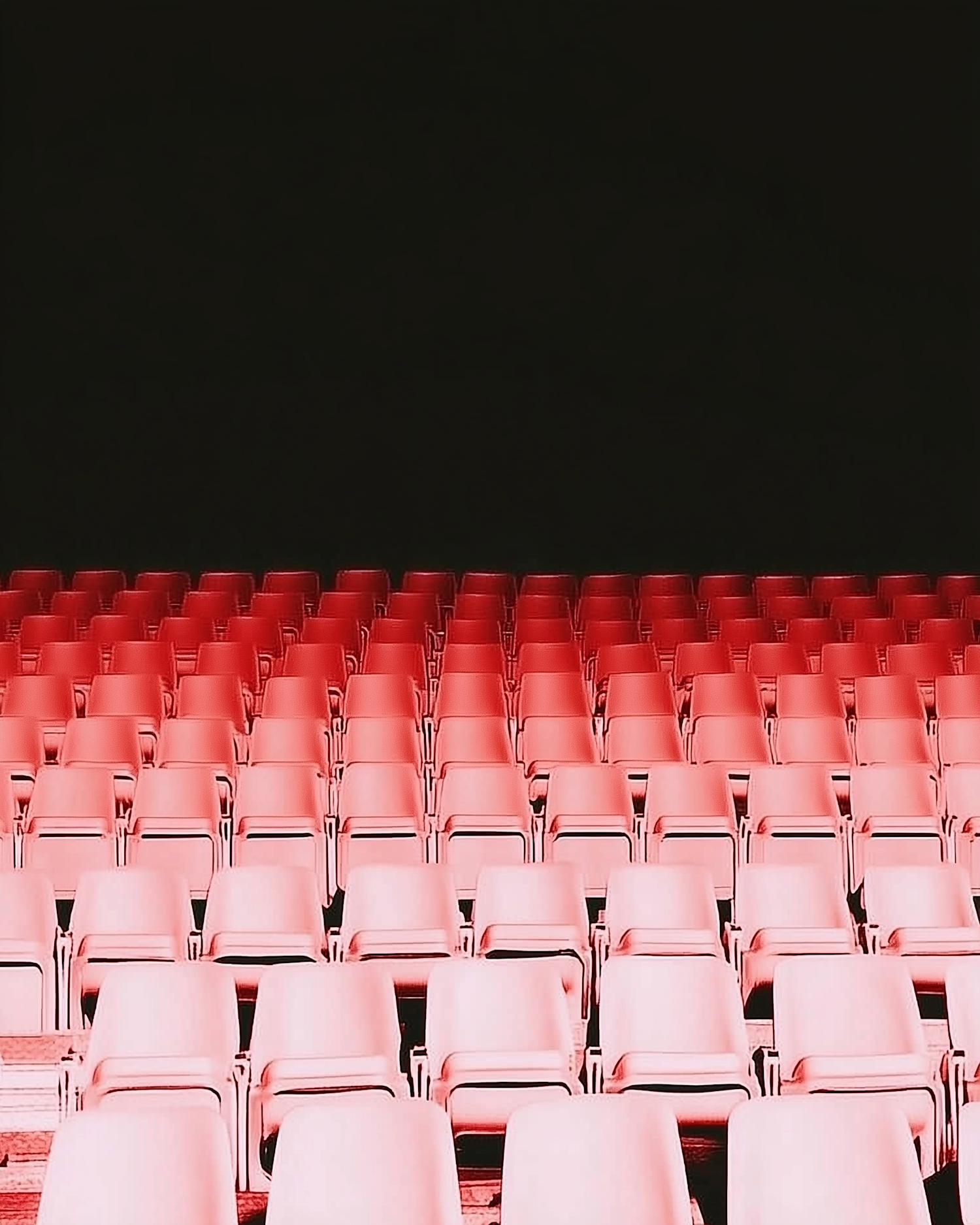 Symmetrical rows of red chairs in a dark auditorium, creating a striking contrast and a sense of anticipation.