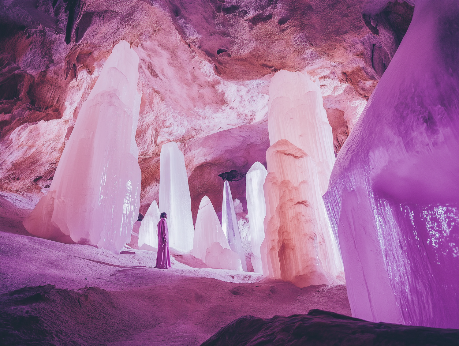 A mystical cave with glowing pink and purple stalagmites and a lone figure in a pink robe, creating a dreamlike atmosphere.