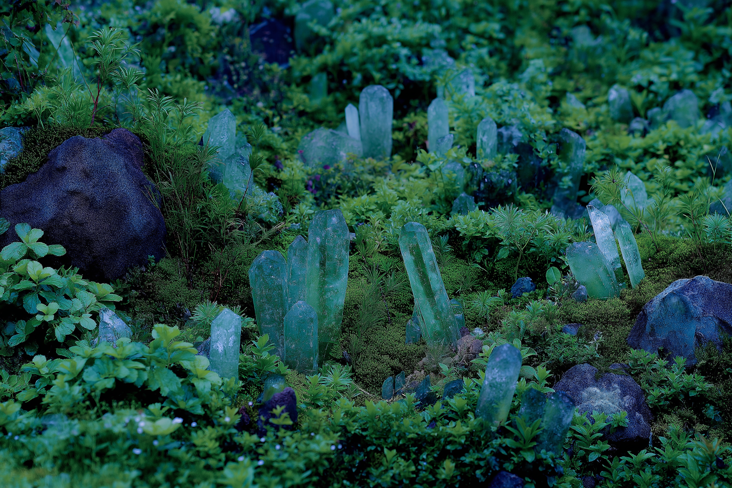 A verdant scene featuring green crystal formations amidst dense moss and vegetation; the image radiates a serene and mystical ambiance.